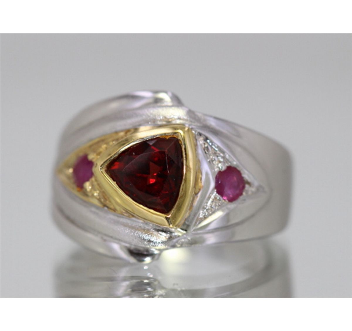 Sterling Silver w/ Gold Tone Trillion Cut Garnet center 2 Round Ruby side stones, size 6.75, Great gift