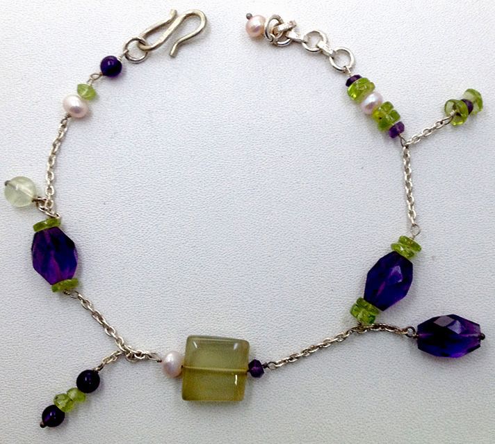 Sterling Silver 9.83 Approx grams including, Peridot Chips, Pink Pearl, and Amethyst, S Clasp 8 inch