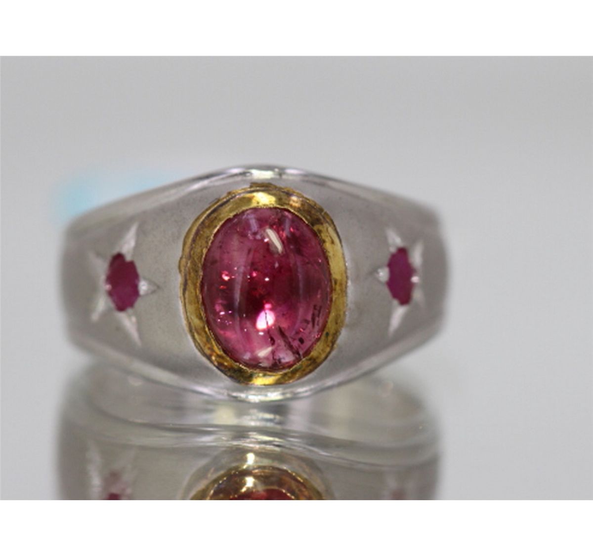 Sterling Silver w/ Gold Tone Oval Cabochon Pink Tourmaline, 2 Round Ruby side stones, size 7.75, Great Gift