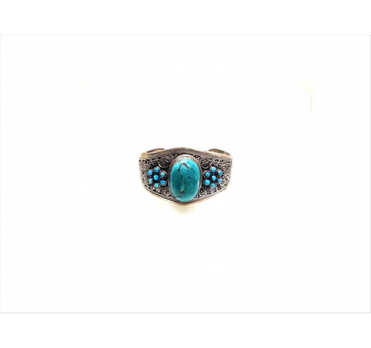 Vintage Handmade Big Blue/Green Turquoise center stone filigree work around round Blue Turquoise flower design, 60.43 approx grams including gems, open back should fit any wrist