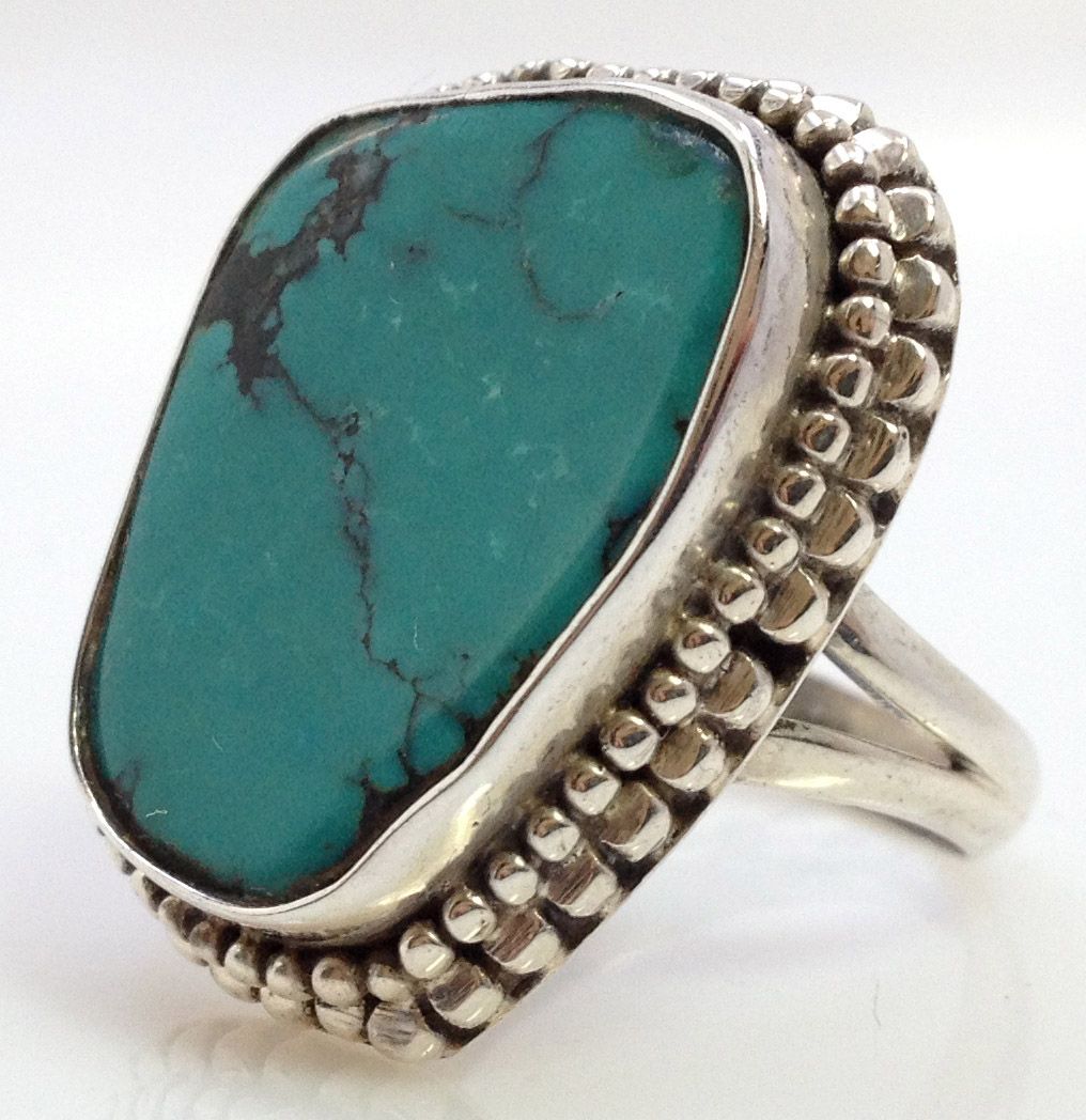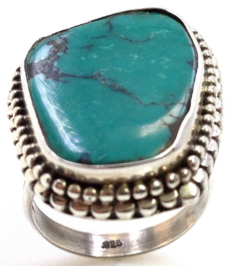 Vintage Style Ring, Turquoise unique Shape Hand made design 21x12 approx mm stone, size 8, 9.34 approx grams including gem, will match well with any of our bangles on auction