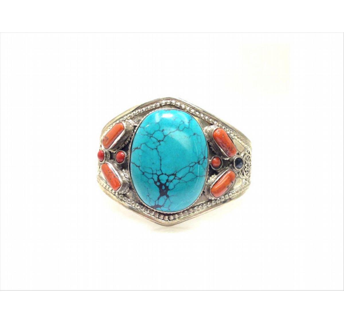 Vintage Handmade Big Turquoise center stone w/ Red Coral side stones, 53.06 approx grams including gems, open back should fit any wrist