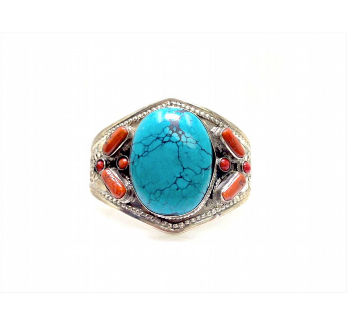 Vintage Handmade Big Oval Turquoise center stone w/ Red Coral side stones, 68.08 approx grams including gems, open back should fit any wrist