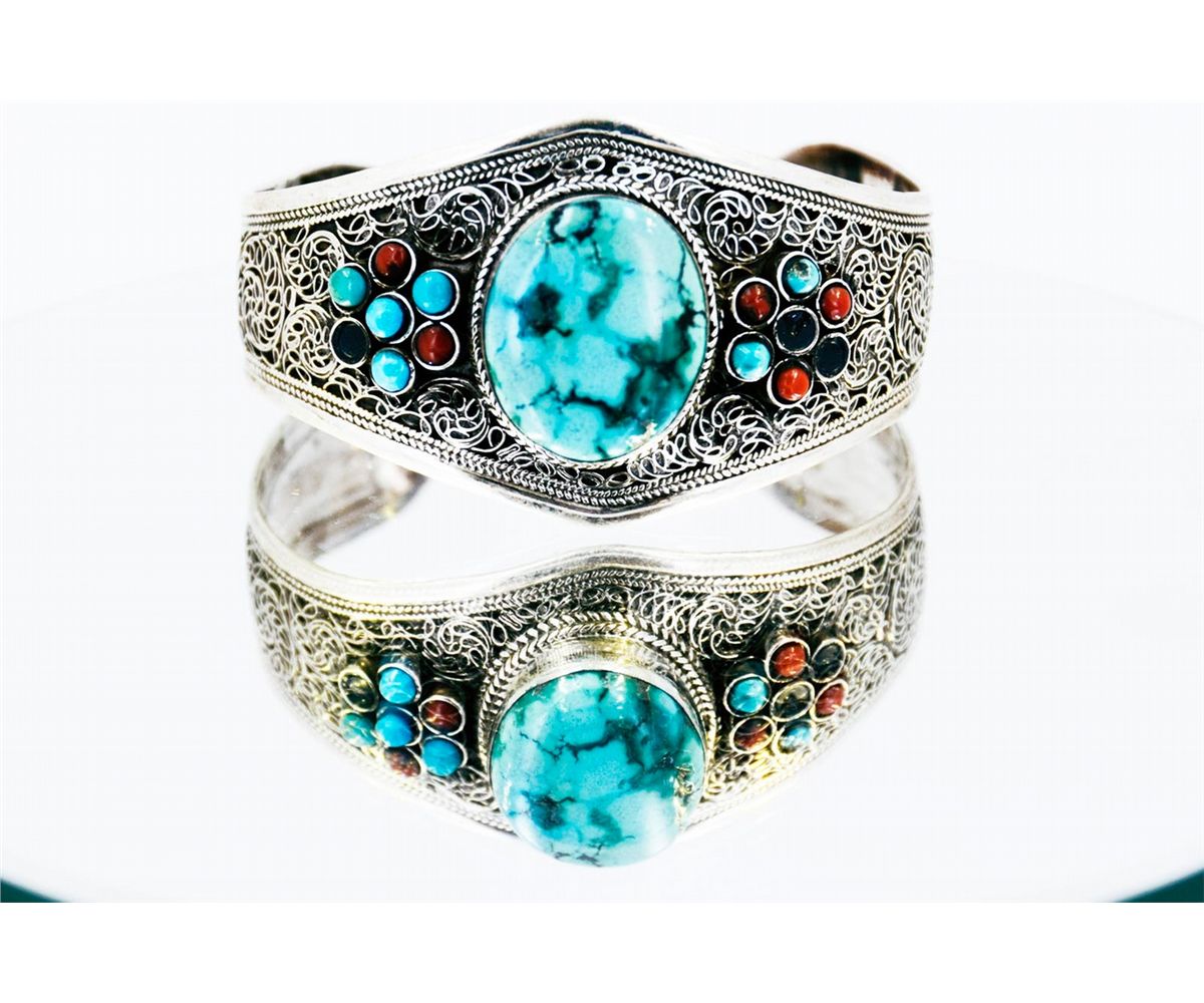 Sterling Silver .925 Turquoise w/ Red Coral Cuff Bangle