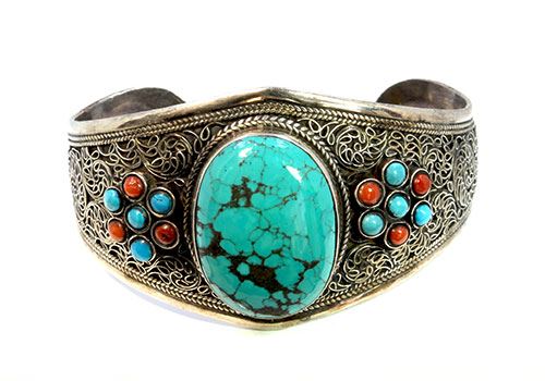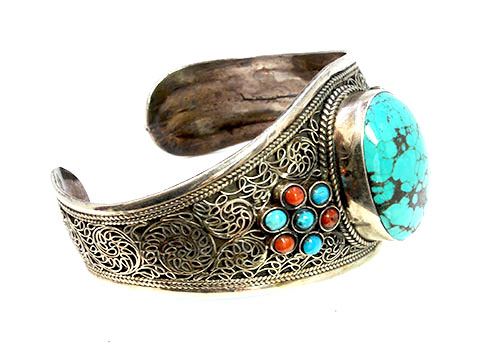 Sterling Silver .925 Turquoise w/ Red Coral Cuff Bangle