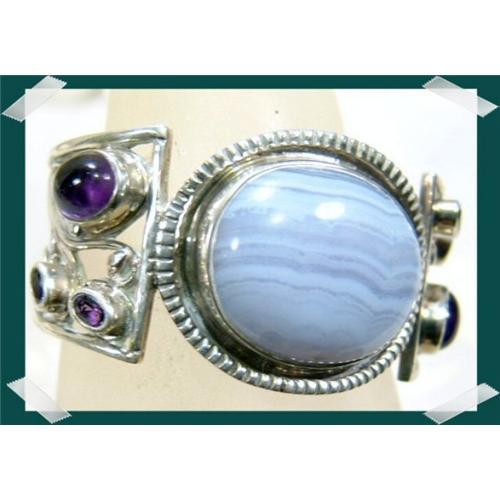 PLEASE NOTE I only ship to Canada and USA. If paypals is used the address MUST be confirmed and I require a signature on all paypals shipments. Thanks Steven. <P>A very dramatic presentation of luxurious REAL blue lace agate complimented with amethyst gemstones accented with EXTRAVAGANT sterling for those that adore the most unusual! The stones are magnificent radiating the dramatic jewel-tones in such a modern sterling setting. The cuff has height of 35mm or approximately 1.5" and is hallmarked 925 sterling. The inside measurement is 6" plus a 1" opening. A gram weight of 62.