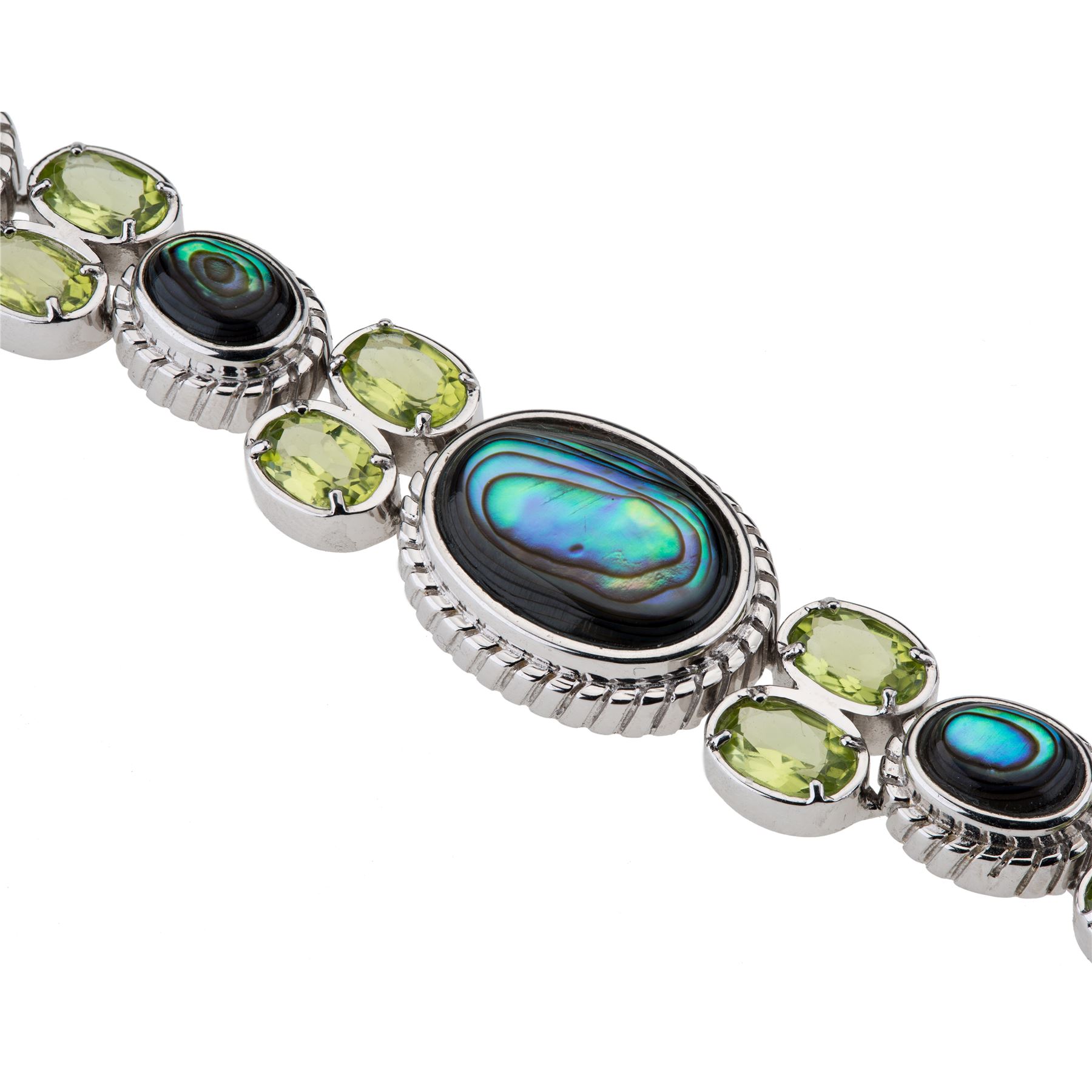 Pangea Mines Treasured Gems Collection Genuine sparkling peridot & abalone gemstones adorn this lovely design from the Pangea Mines Treasured Gems Collection. Crafted in gleaming rhodium over sterling silver with a convenient, secure slide insert clasp, this smart design will beautifully complement your wardrobe.
