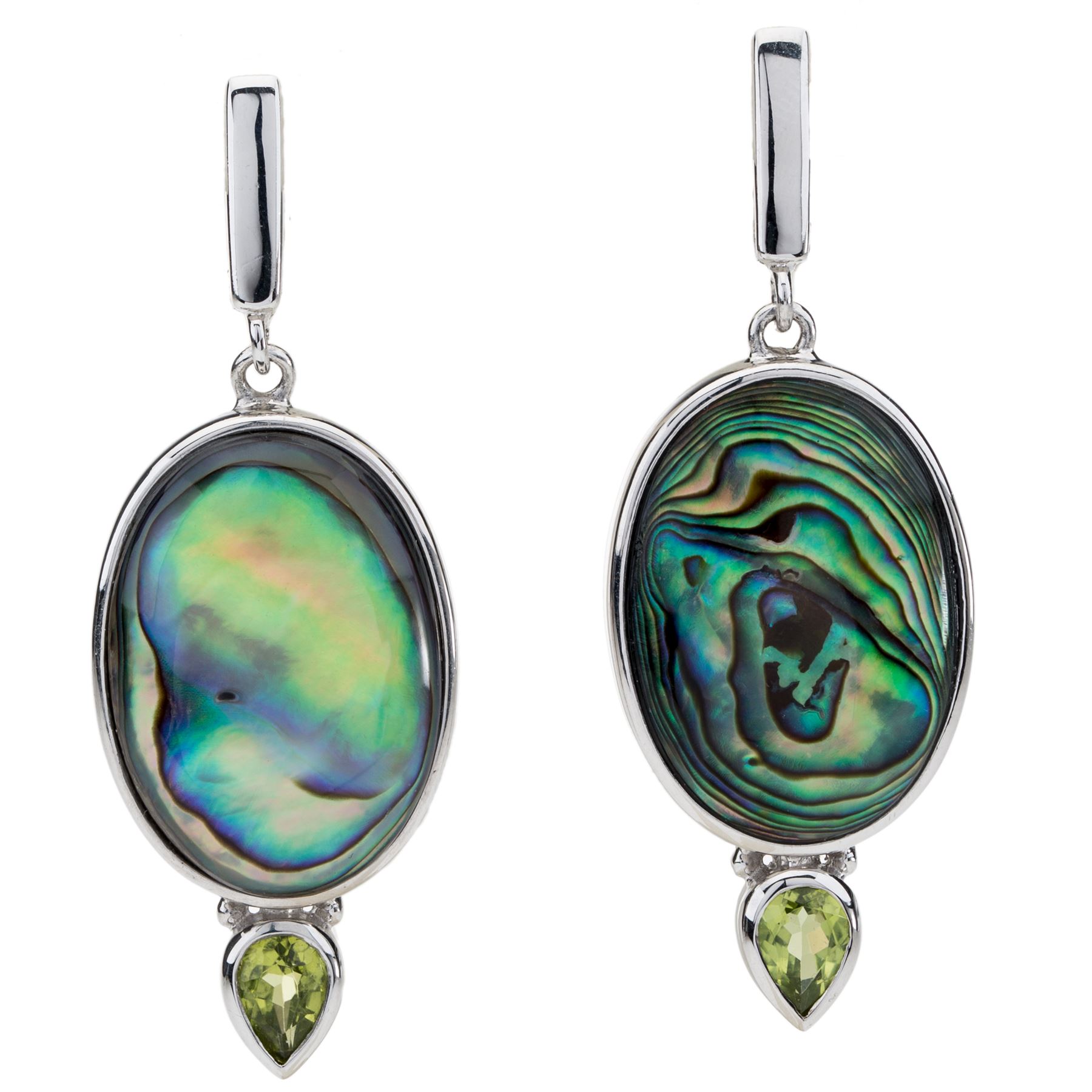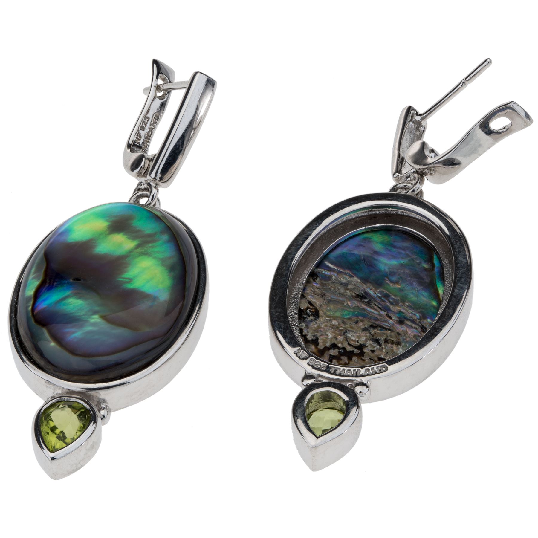Each finely crafted Sterling Silver earring showcases a large oval Abalone cabochon with one pear cut Peridot just below it. Latch backs connect with ease to get you on your way quick. So break out your favorite maxi dress, pair it with these earrings and set out for a day of shopping. People will notice them and you! Embrace your love of bold fashion! Not exactly demure, these dangling drop earrings deliver compelling color in spades. Metal: Rhodium over sterling silver
