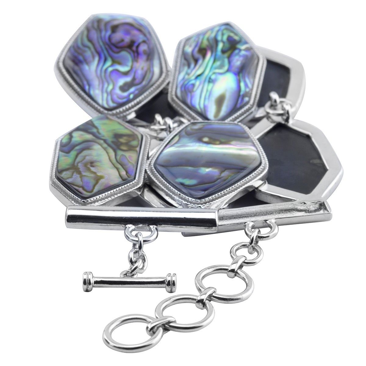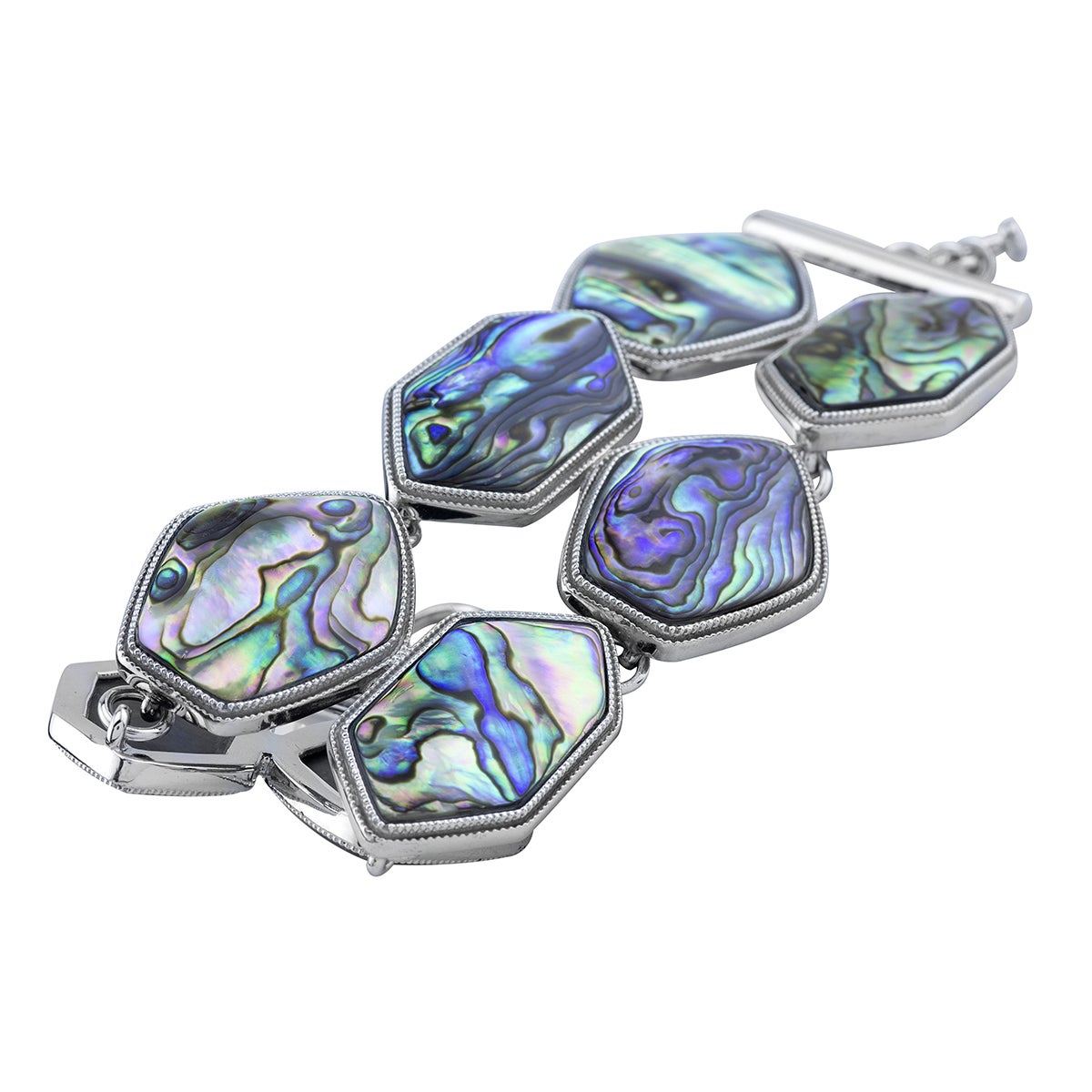 Set in 925 Sterling Silver  Genuine Abalone Shell is that gem from the sea that blazes a trail of lovely iridescent hues whichever way you look at it! Two rows of freeform shaped abalone stations travel between two sides of a toggle clasp to create this showstopper bracelet. Beaded textures surround each stone and ripple with a very subtle shimmer in the light. And that toggle clasp? Well with three jump rings, you'll find the fit that's just right for you.                                                                Metal: Rhodium over sterling silver