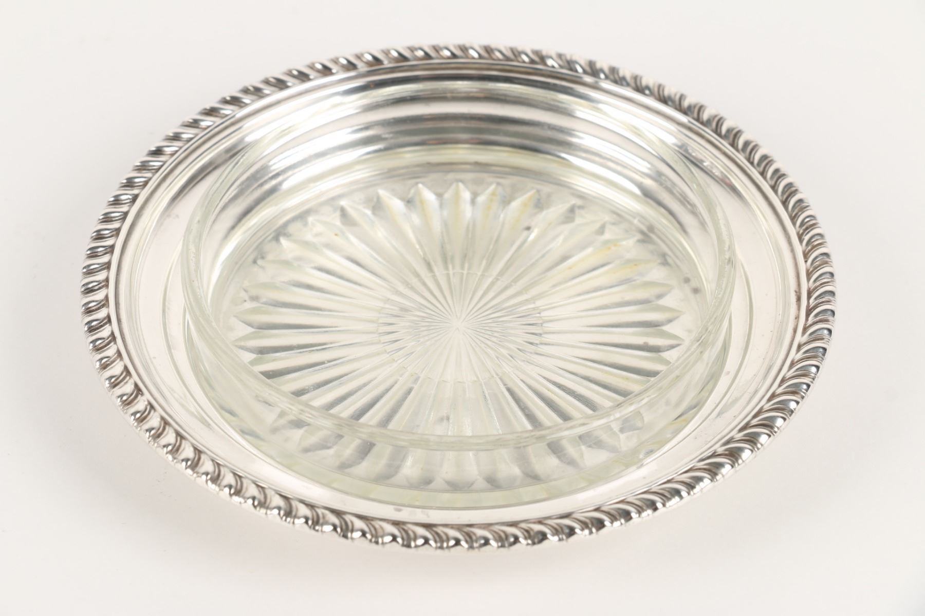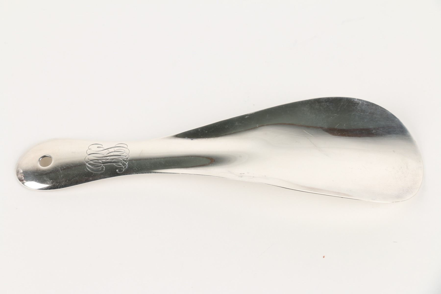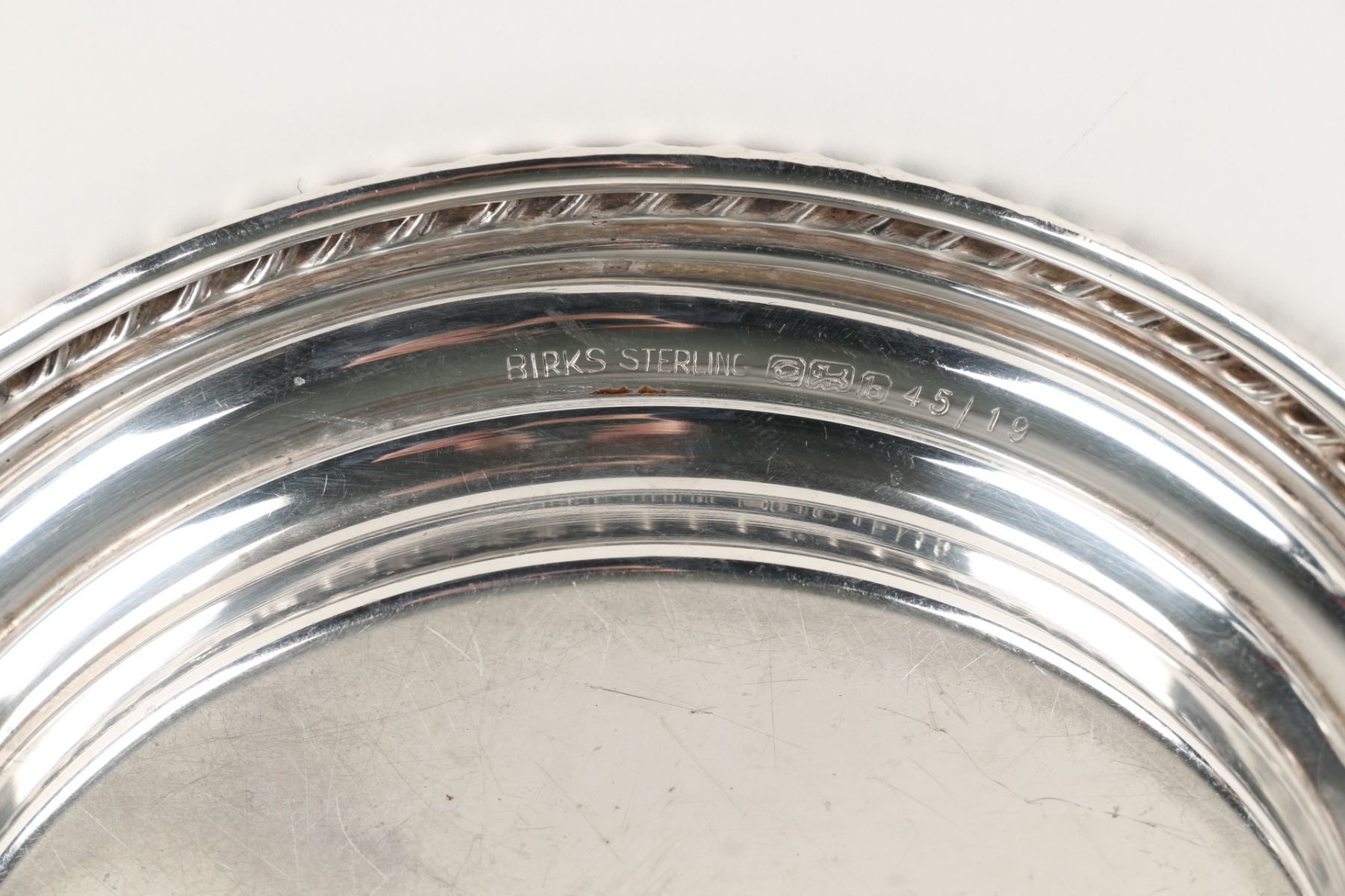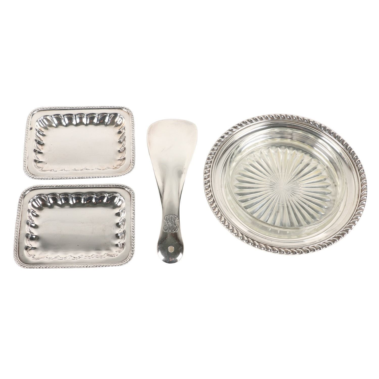 Lot 349 - Four (4) pieces. Includes one (1) wine coaster with glass liner - Birks, Two (2) rectangular trays, and one (1) shoe horn. 5.5" dia. Gross combined weight, 222g (glass removed). $100-200.