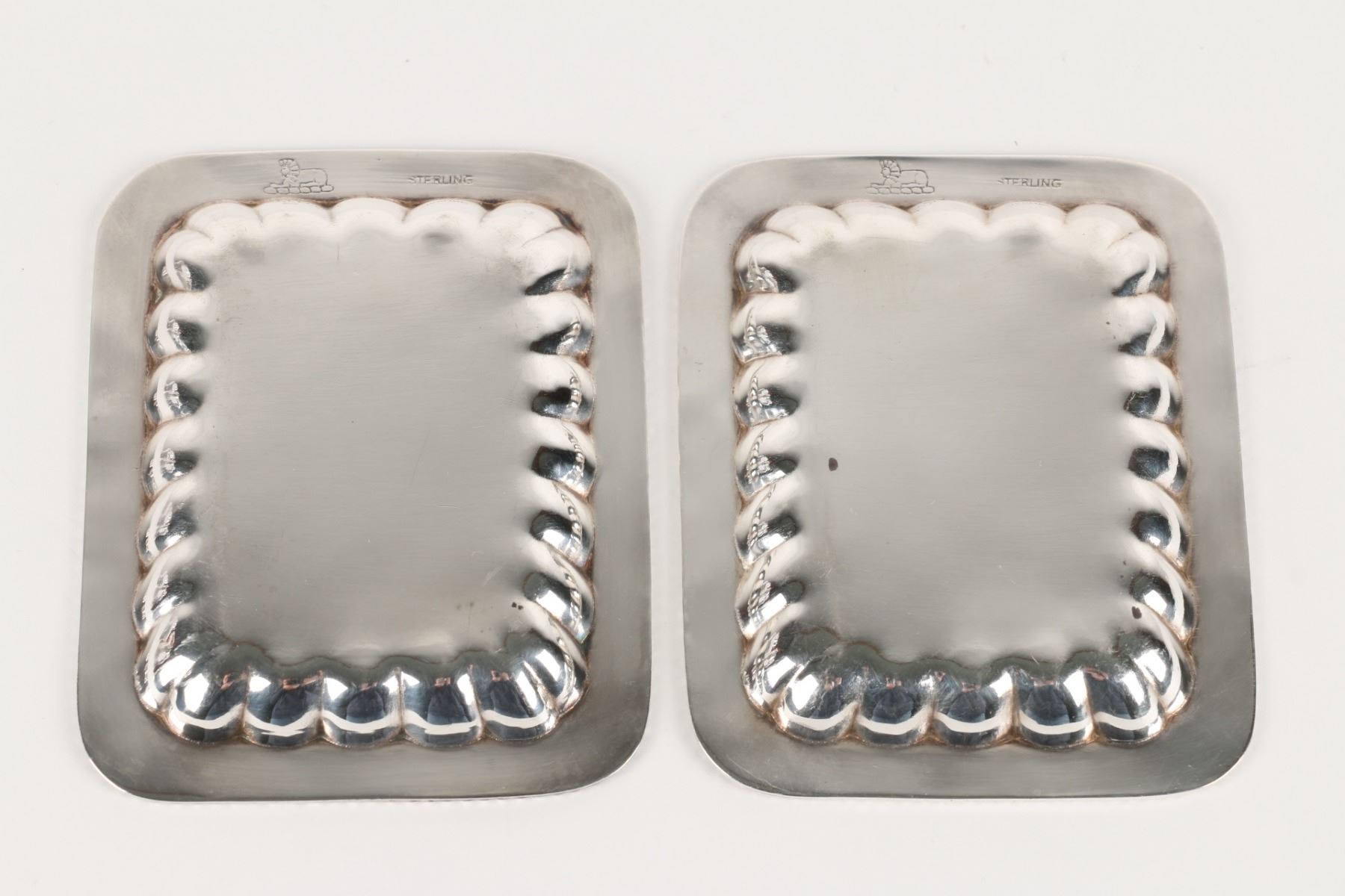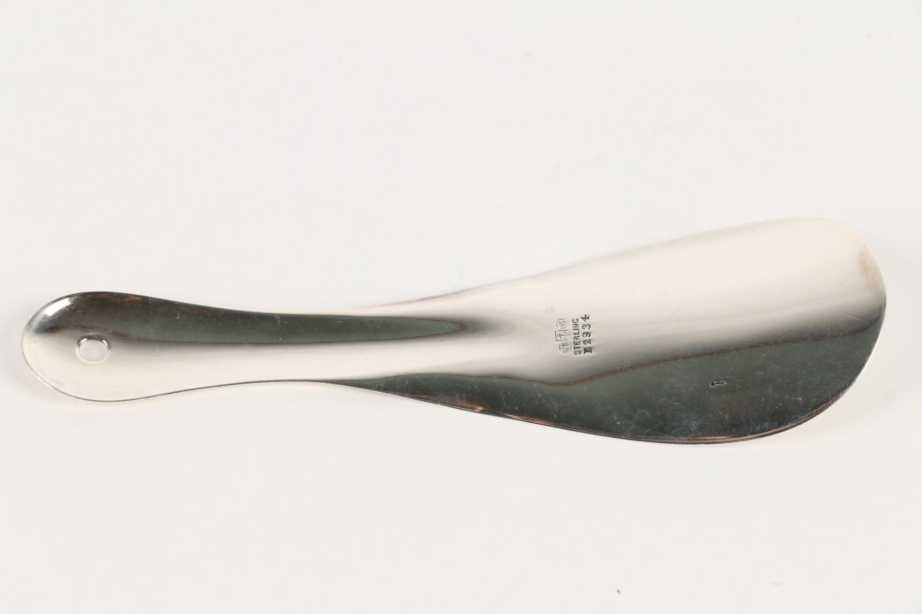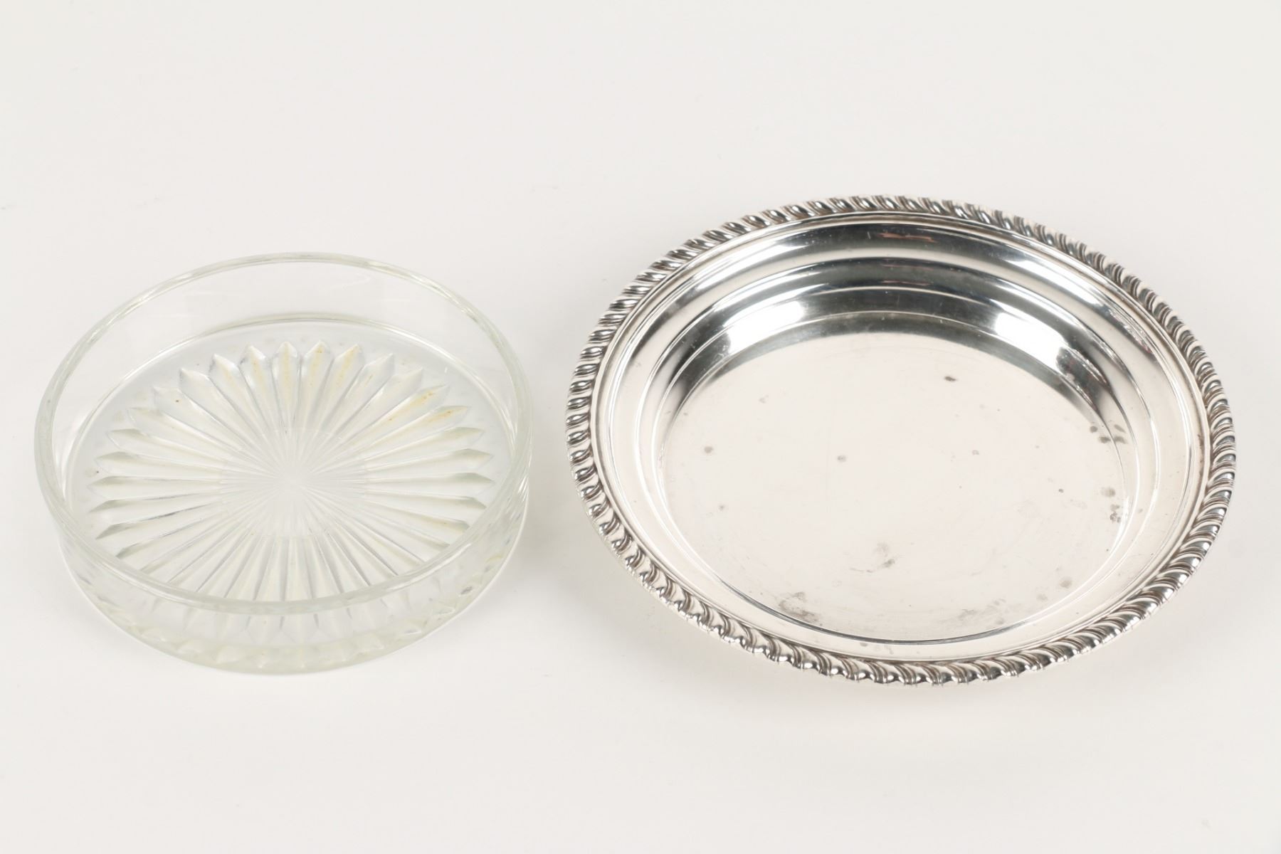 Lot 349 - Four (4) pieces. Includes one (1) wine coaster with glass liner - Birks, Two (2) rectangular trays, and one (1) shoe horn. 5.5" dia. Gross combined weight, 222g (glass removed). $100-200.