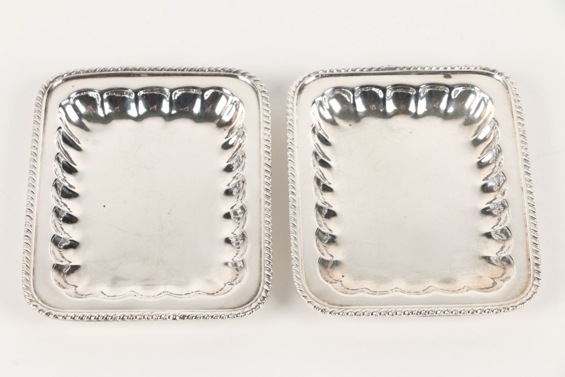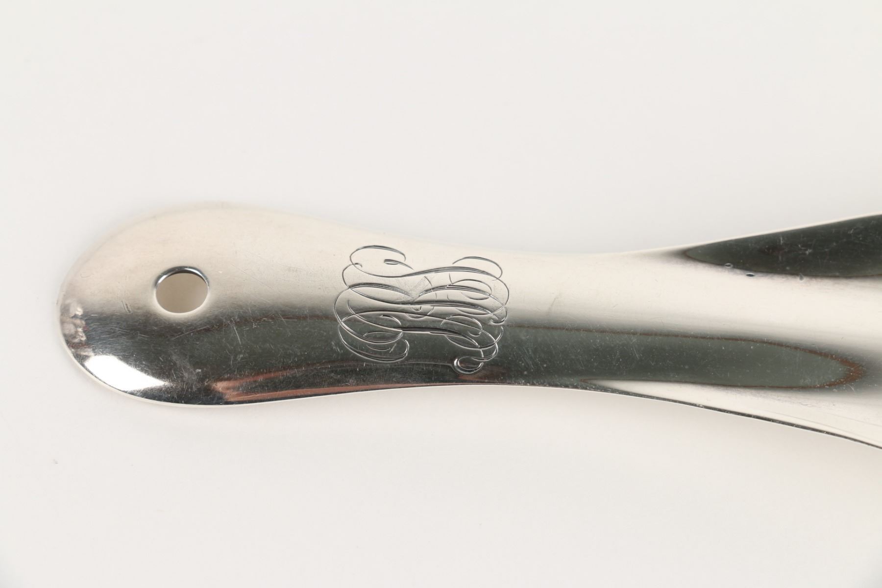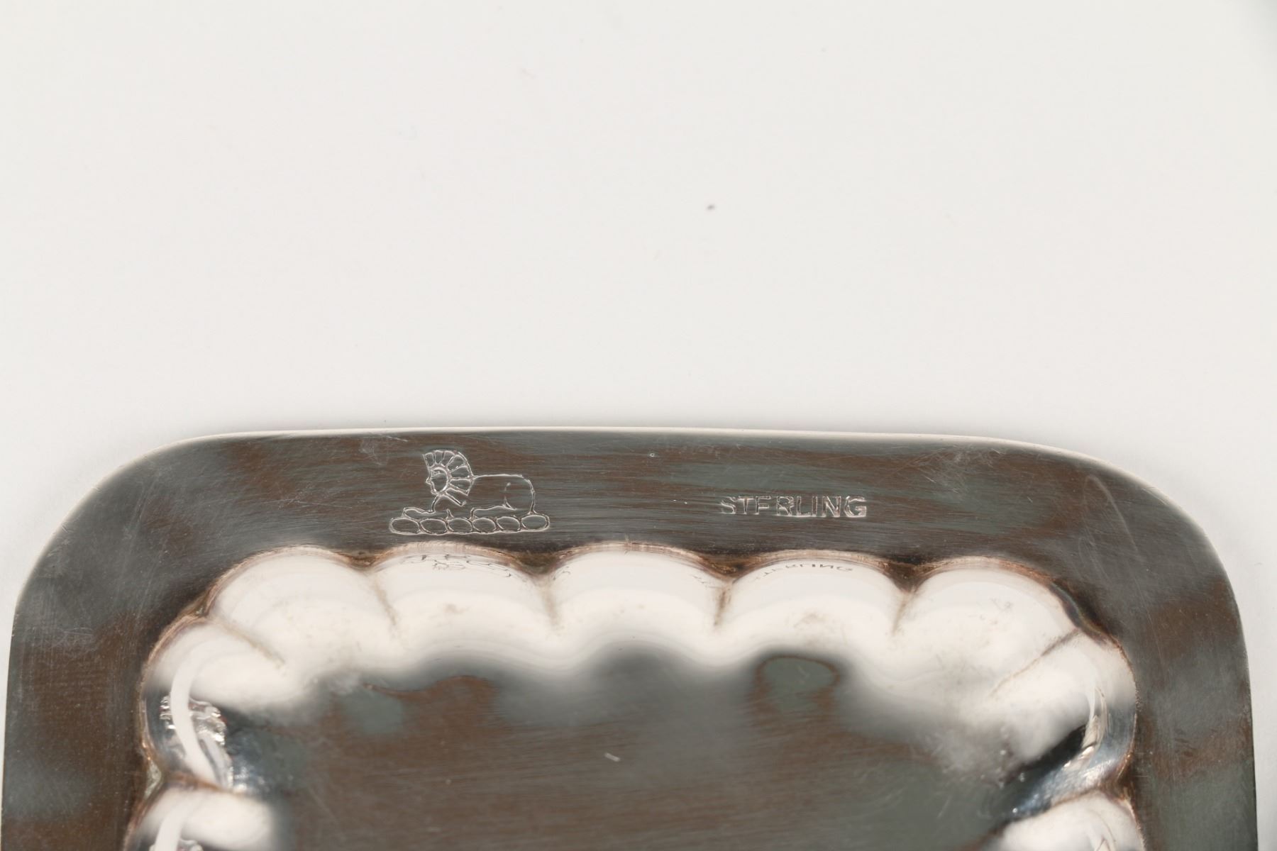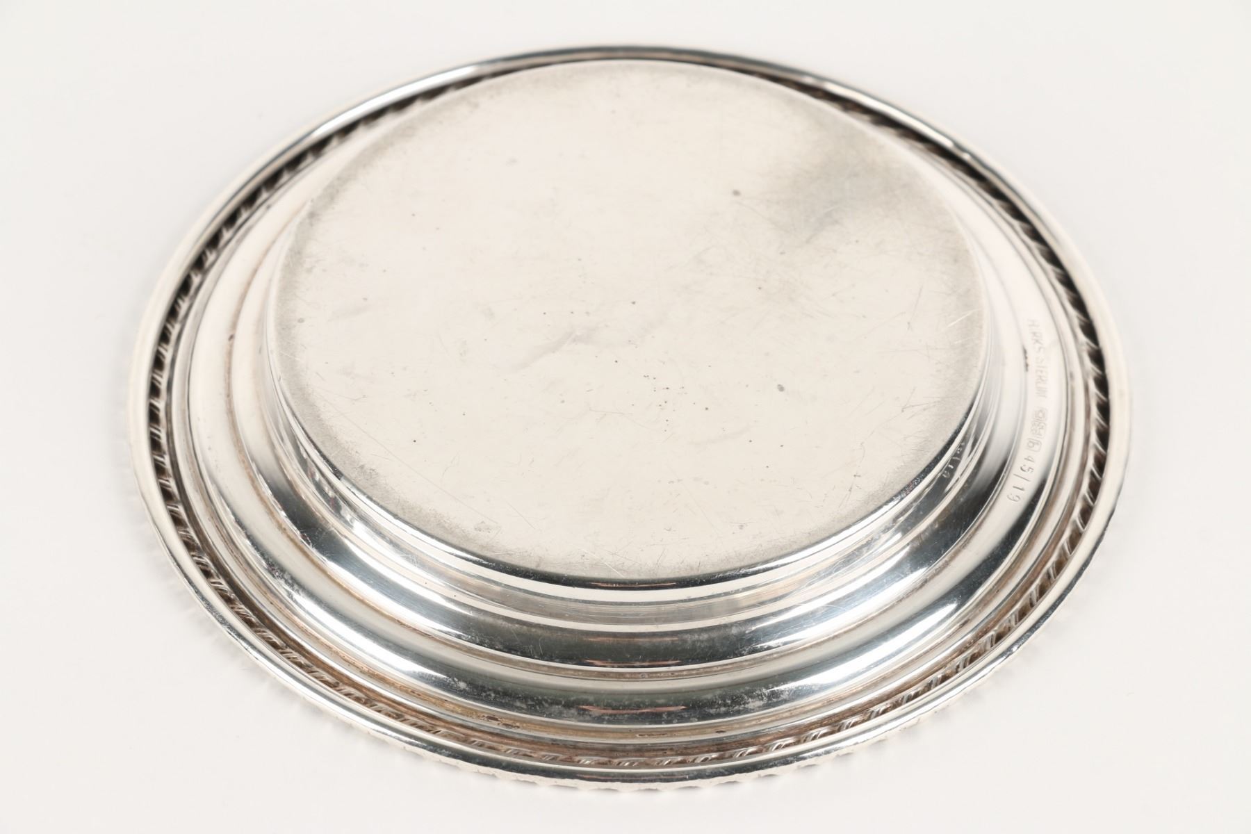 Lot 349 - Four (4) pieces. Includes one (1) wine coaster with glass liner - Birks, Two (2) rectangular trays, and one (1) shoe horn. 5.5" dia. Gross combined weight, 222g (glass removed). $100-200.
