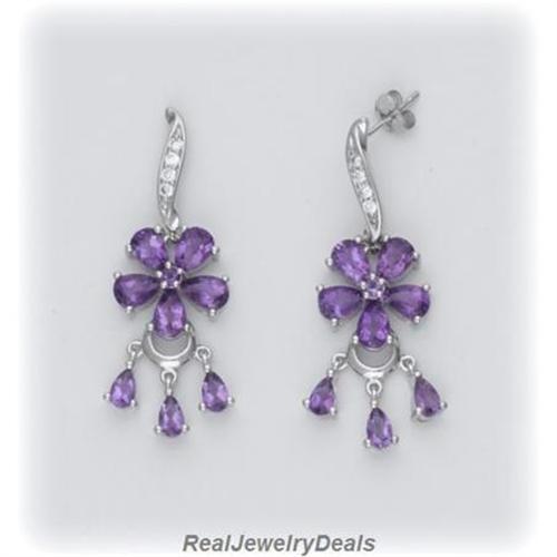 Solid Sterling Silver Genuine Amethyst Flower Earrings