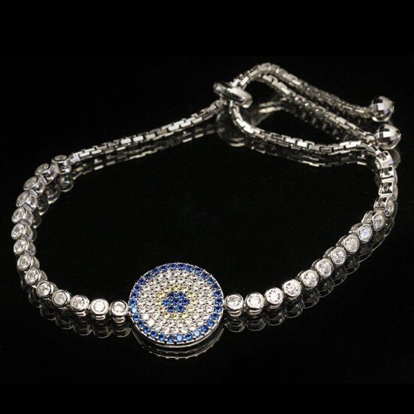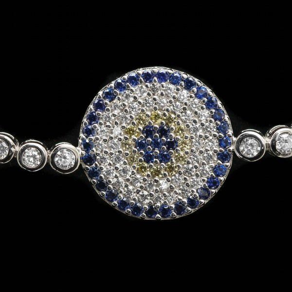 A sterling silver adjustable lariat bracelet featuring a cubic zirconia encrusted round circle and center sapphire bracelet. Marked 925. This item is accompanied with a certificate of authenticity and appraisal.