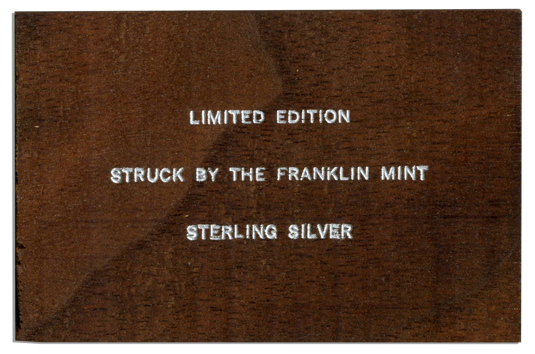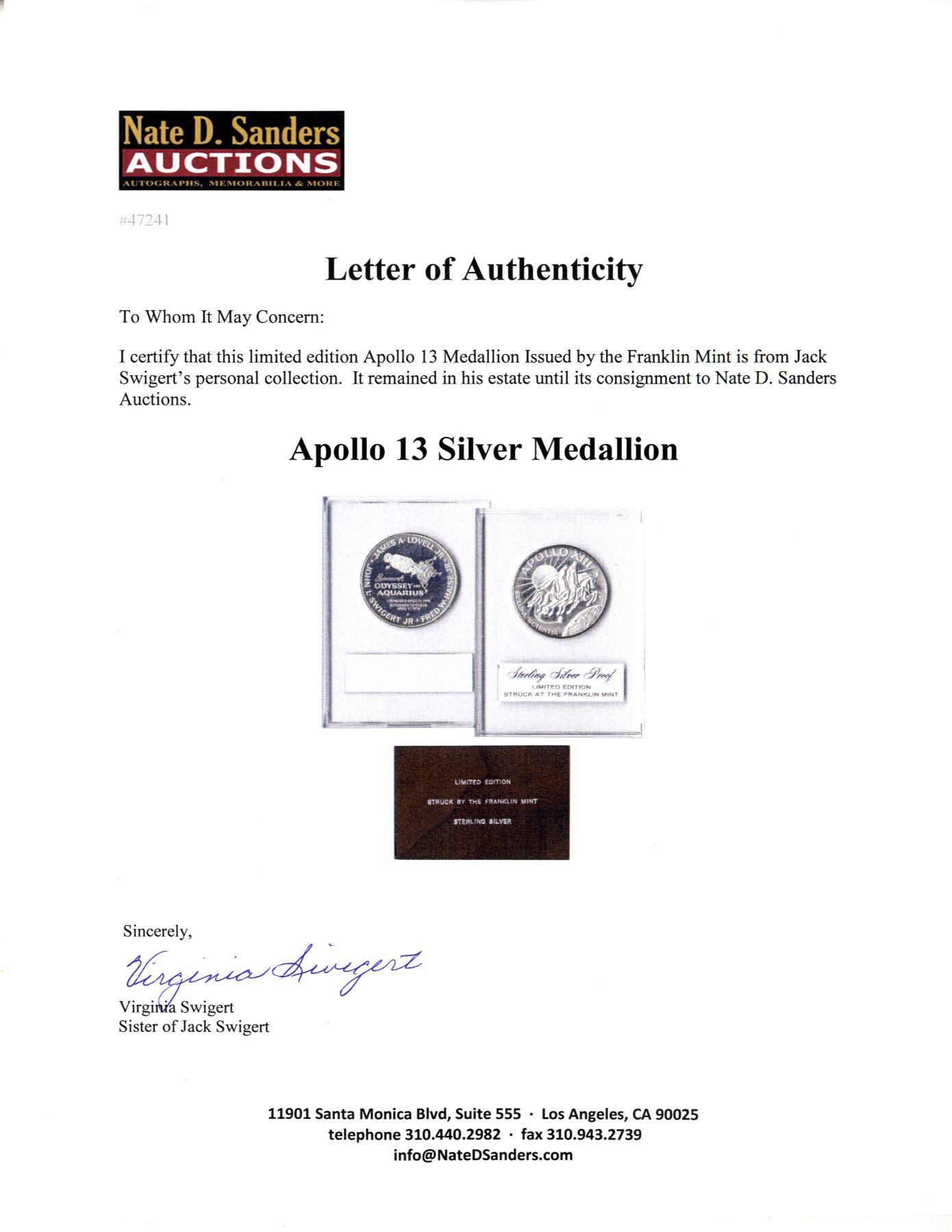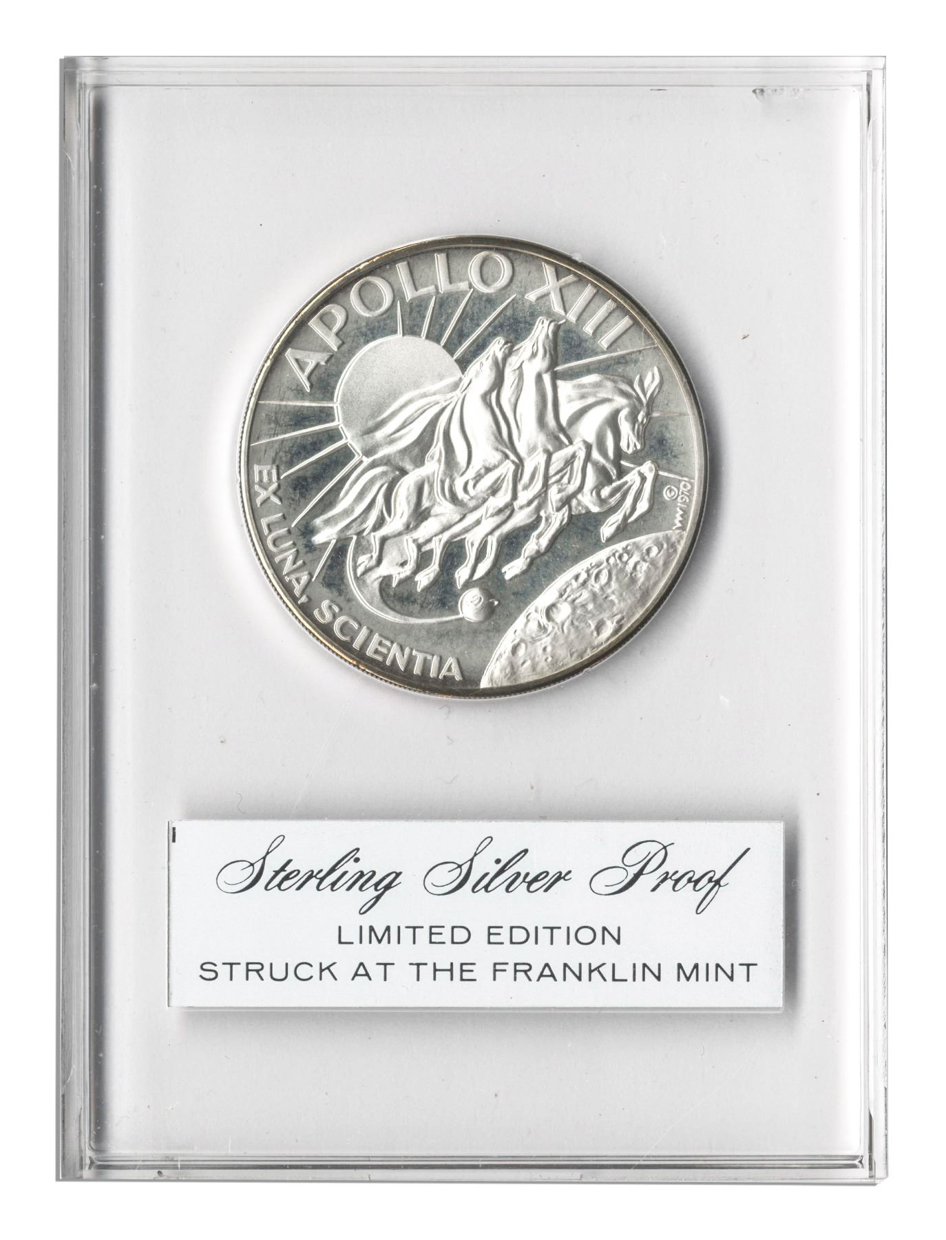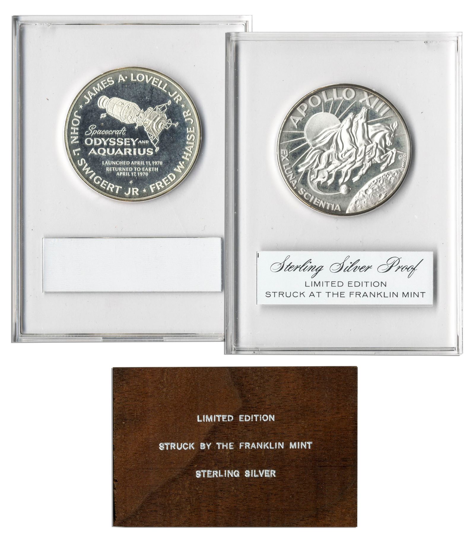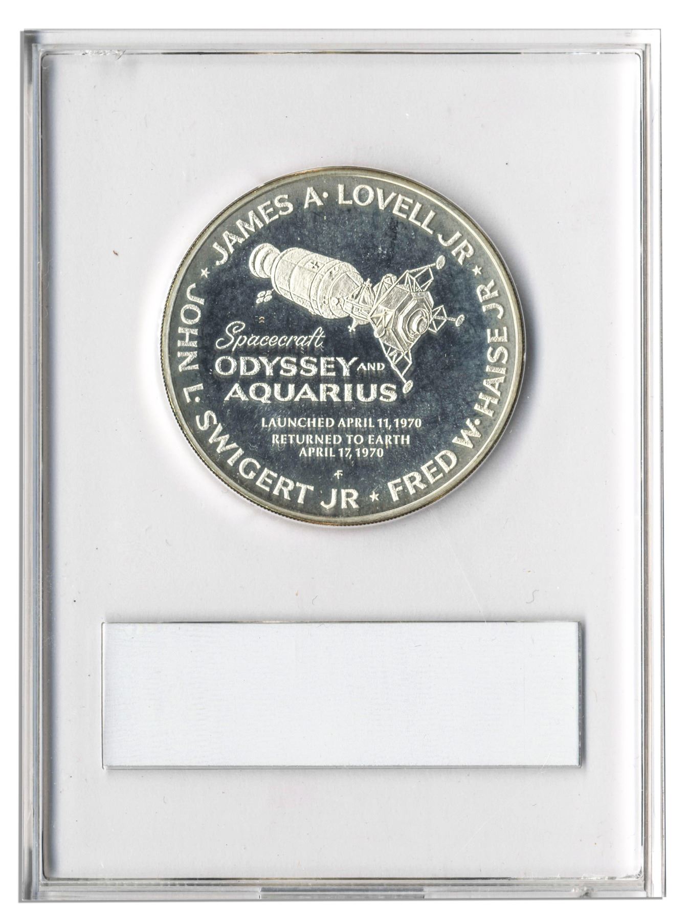 Sterling silver Apollo 13 medallion owned by Jack Swigert. Limited edition medal issued by the Franklin Mint features the mission insignia to obverse: a trio of horses galloping over the moon. Reverse features depictions of the Odyssey and Aquarius modules, along with the dates of the launch and early return. Proof medal measures 1.5'' and is encapsulated to an overall size of 2.75'' x 3.75''. Accompanied by a wooden stand with silver print on the underside indicating limited edition and sterling. Discoloration to rim of medal and some dulling around edges, else near fine. With an LOA from the Swigert estate.