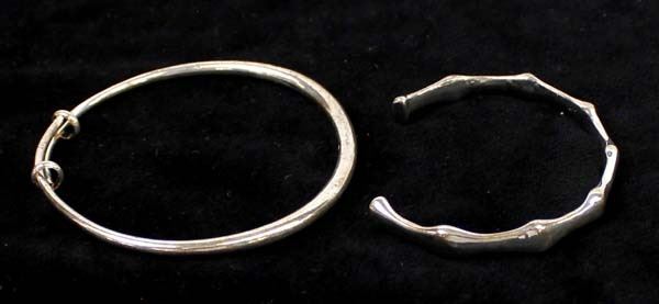 Silver Bangle and Cuff Braclets, includes 1. Sterling Cuff Bracelet, inside measures 6.5'' which includes the gap x 3/8''W and is stamped .925 2. Sterling Bangle Bracelet, measures 2.75''D and is stamped .925, total gram wt. of both bracelets is 27.94