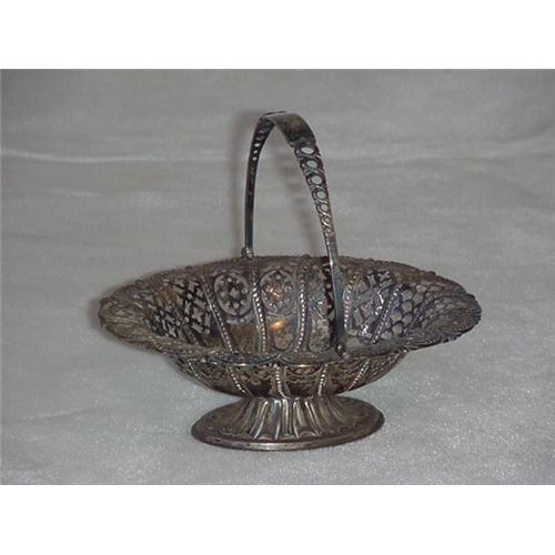 A beautiful little turn of the 20th century English sterling silver basket, 6" X 5" oval, 2" tall, 5 1/4" tall with handle. Lovely open work design with English hall marks: Sheffield, 1904, HA makers mark. Marked on handle also. Condition is very good and will polish beautifully. (1)