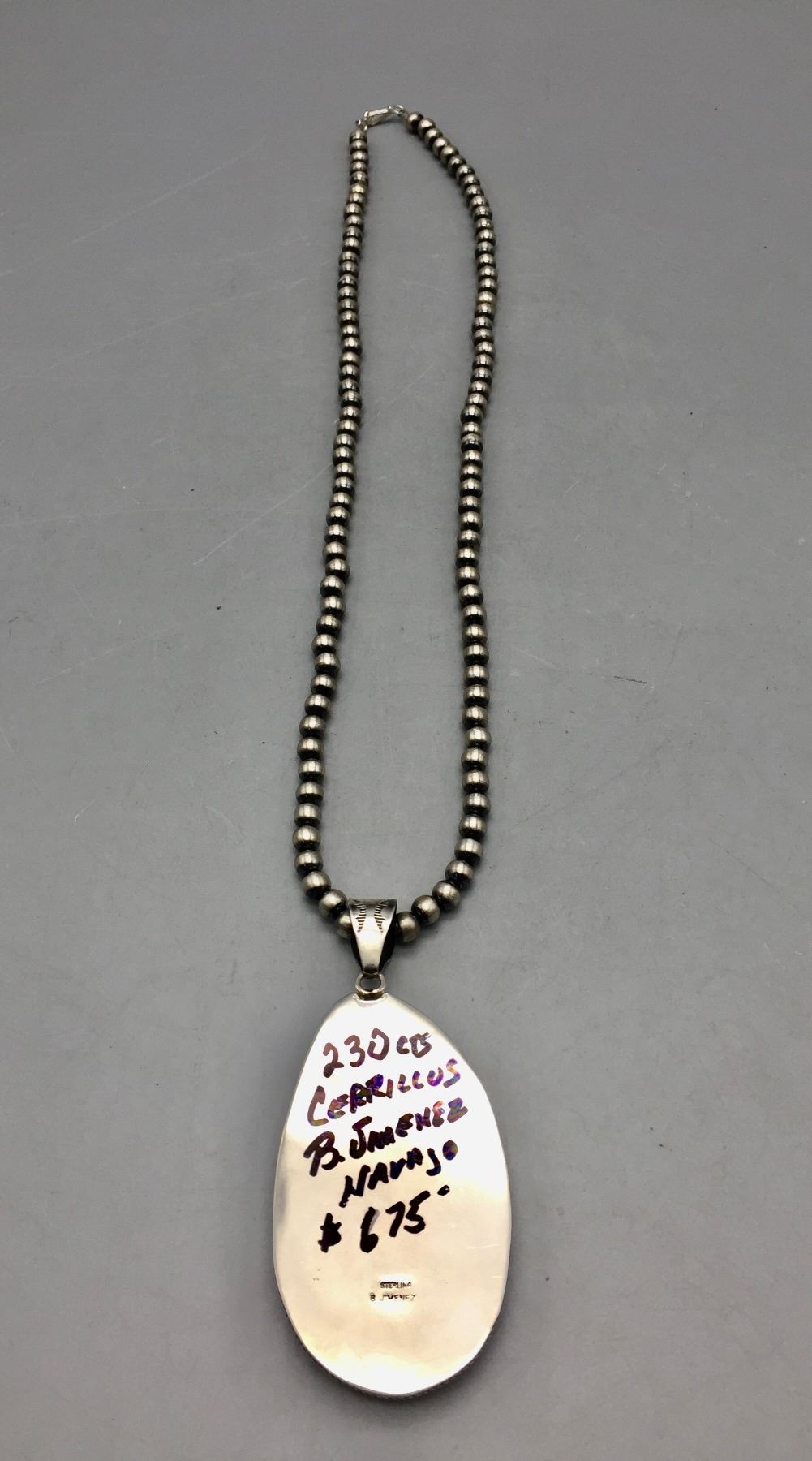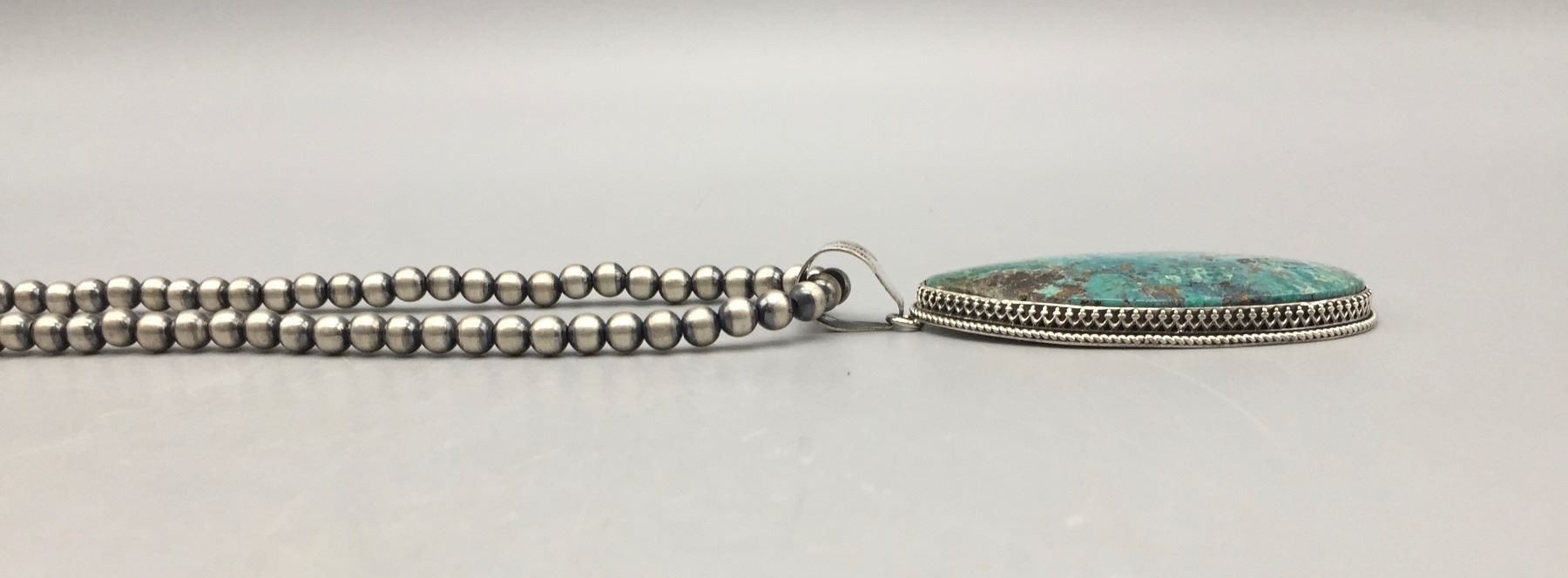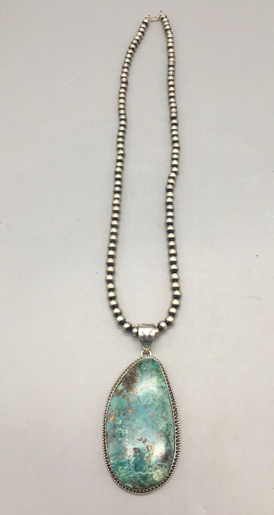 Description: Featured for sale in this lot is a sterling silver bead necklace featuring a larger turquoise cabochon set in sterling silver. Maker: Hallmarked B. Jimenez. Approx. Age: Contemporary. Size: Fits a 22” neck. Pendant measures 1-5/8”w x 3-1/2” long. Weighs 71.4 grams. Condition: Good for its age, normal wear expected. Please look closely at the pictures - they are an important part of our description. Shipping: There will be a $5 handling / packaging fee for shipping this lot. The actual cost of postage will be added on top of that.