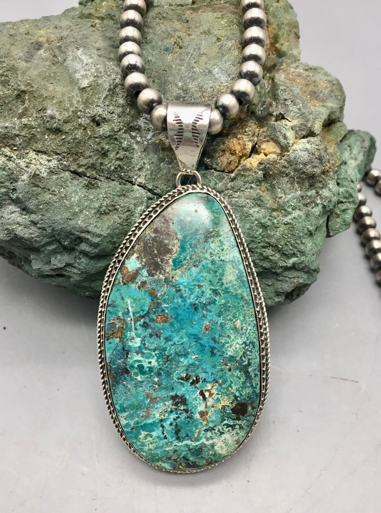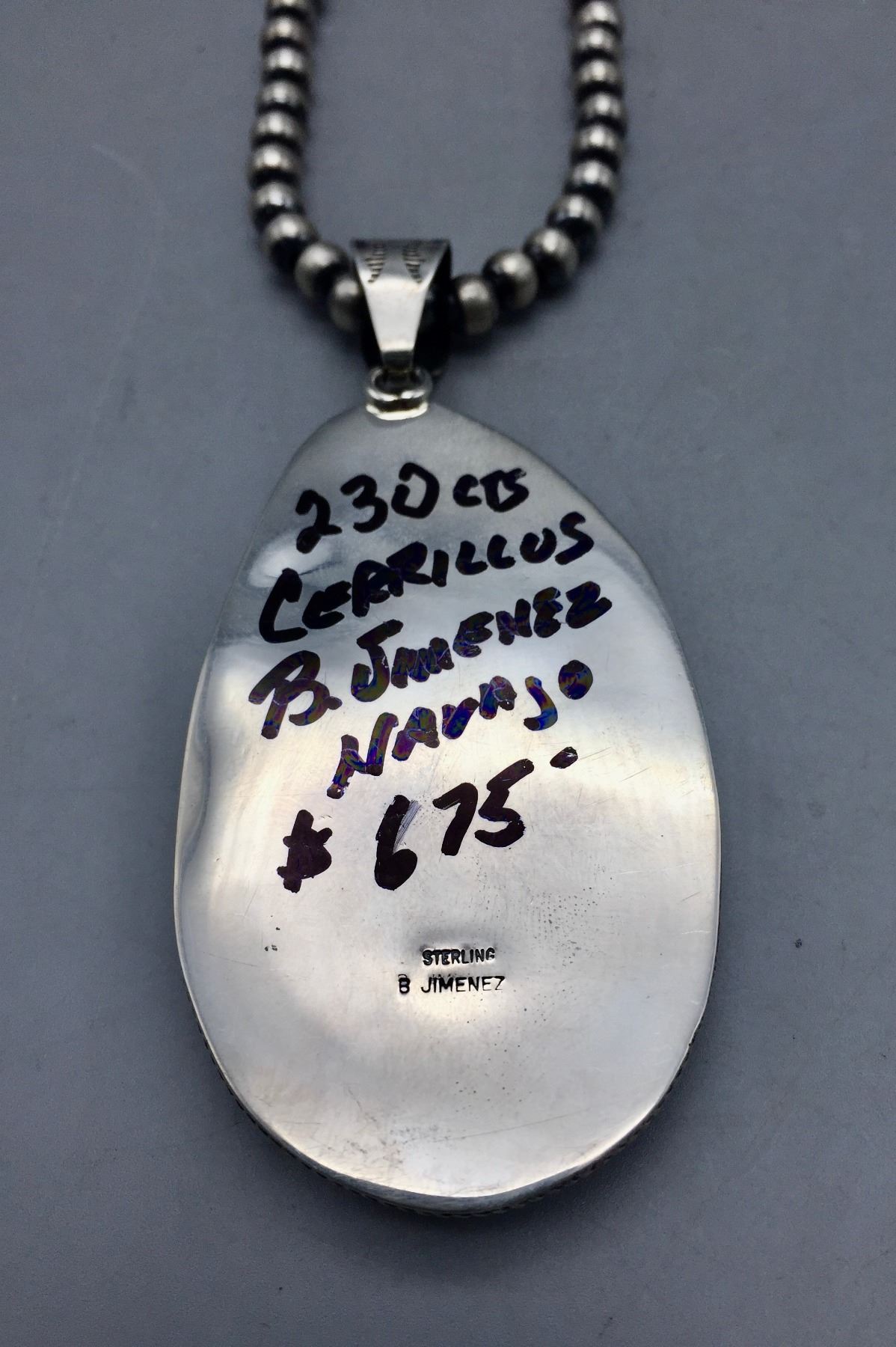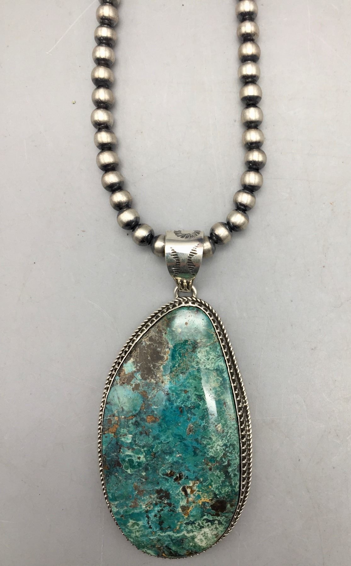 Description: Featured for sale in this lot is a sterling silver bead necklace featuring a larger turquoise cabochon set in sterling silver. Maker: Hallmarked B. Jimenez. Approx. Age: Contemporary. Size: Fits a 22” neck. Pendant measures 1-5/8”w x 3-1/2” long. Weighs 71.4 grams. Condition: Good for its age, normal wear expected. Please look closely at the pictures - they are an important part of our description. Shipping: There will be a $5 handling / packaging fee for shipping this lot. The actual cost of postage will be added on top of that.