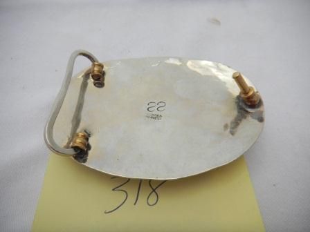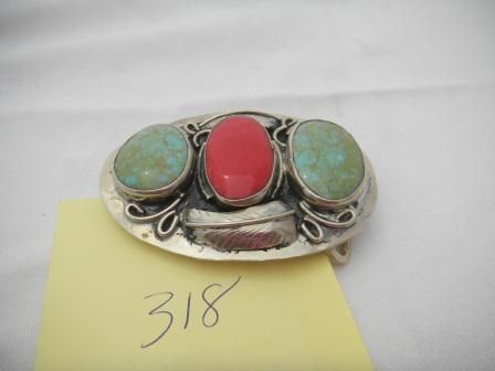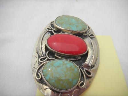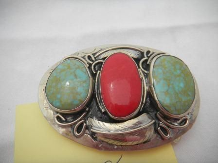 Sterling Silver Belt Buckle with Turquoise and Coral? (Red Stone.) The item has decorative leaf and scroll work. It is marked Sterling and made in Mexico. Shipping $15.00