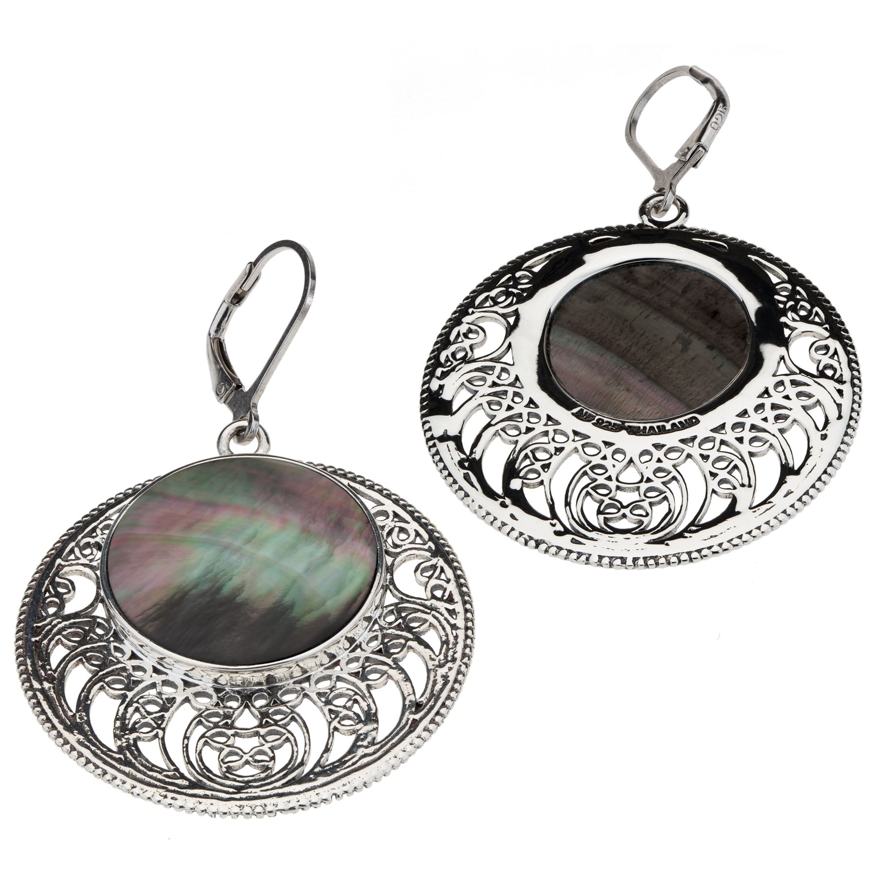 Each earring in the pair showcases one round 20mm genuine Black Mother of Pearl surrounded with a scrollwork-like open design. The polished rhodium over sterling silver of each drop ensures the pair shimmers as lever backs attach them to your lobes. Everyone likes to be noticed. These earrings are sure to stand out without weighing you down.
