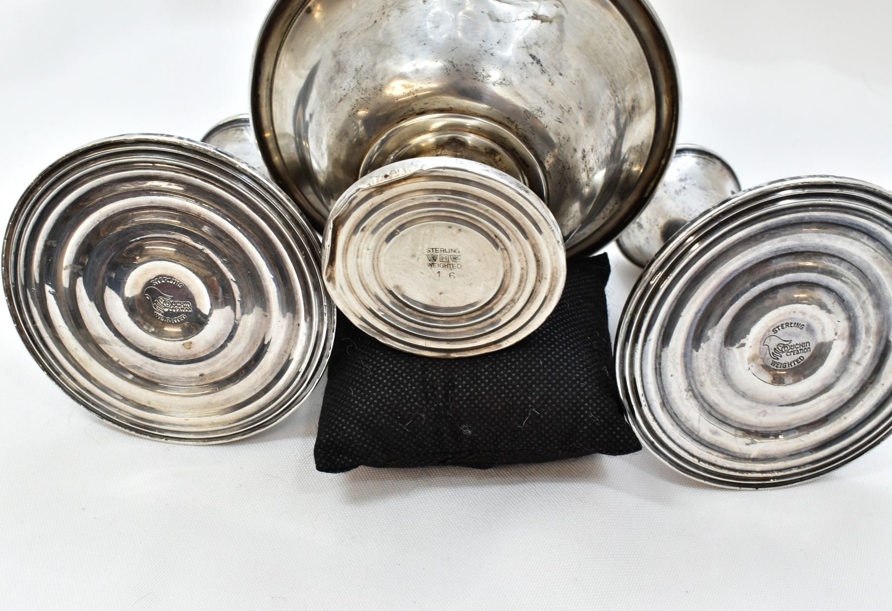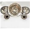 Sterling Silver Bowl and Weighted Candleholders, bowl is marked sterling weighted on the bottom and is hallmarked, the candlestick holders are marked Duchin Created Sterling Weighted, the bowl is dented and measures 2.75''H x 5''D, candlestick holders measure 3.5''H x 3.5''D