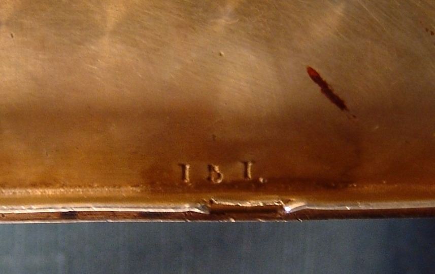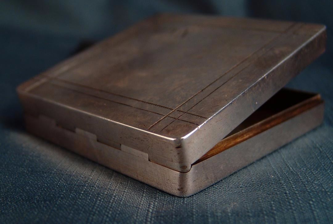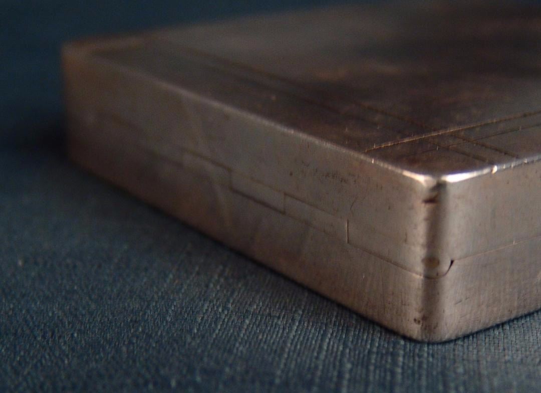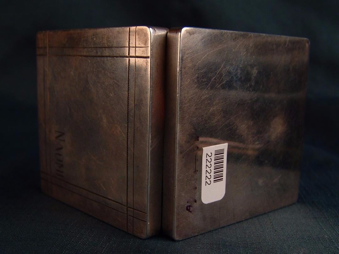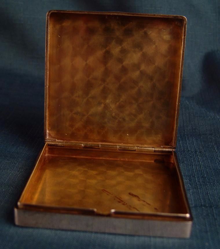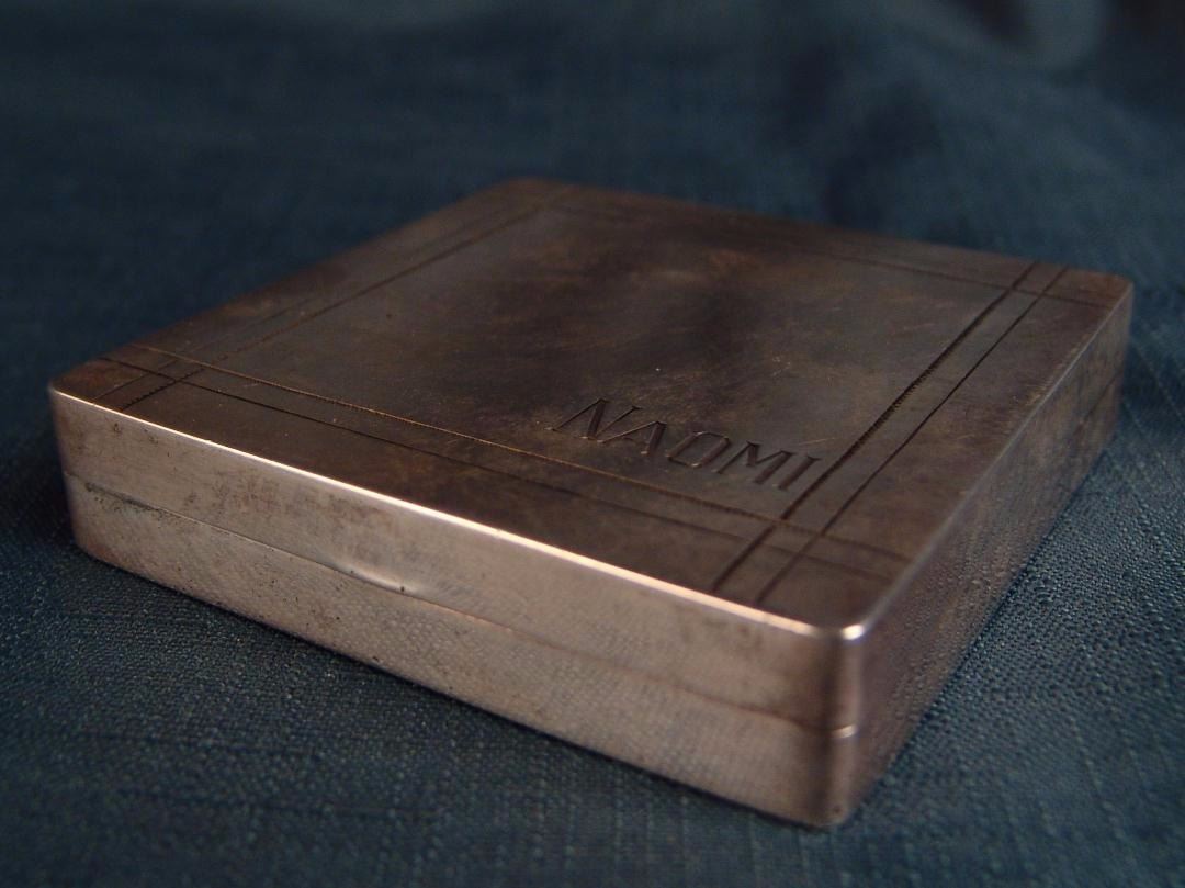 With disappearing hinge, marked France, engine turned inner surfaces, Monogrammed "Naomi", 132 grams, 3 inch square x 5/8" thick, -222222-s