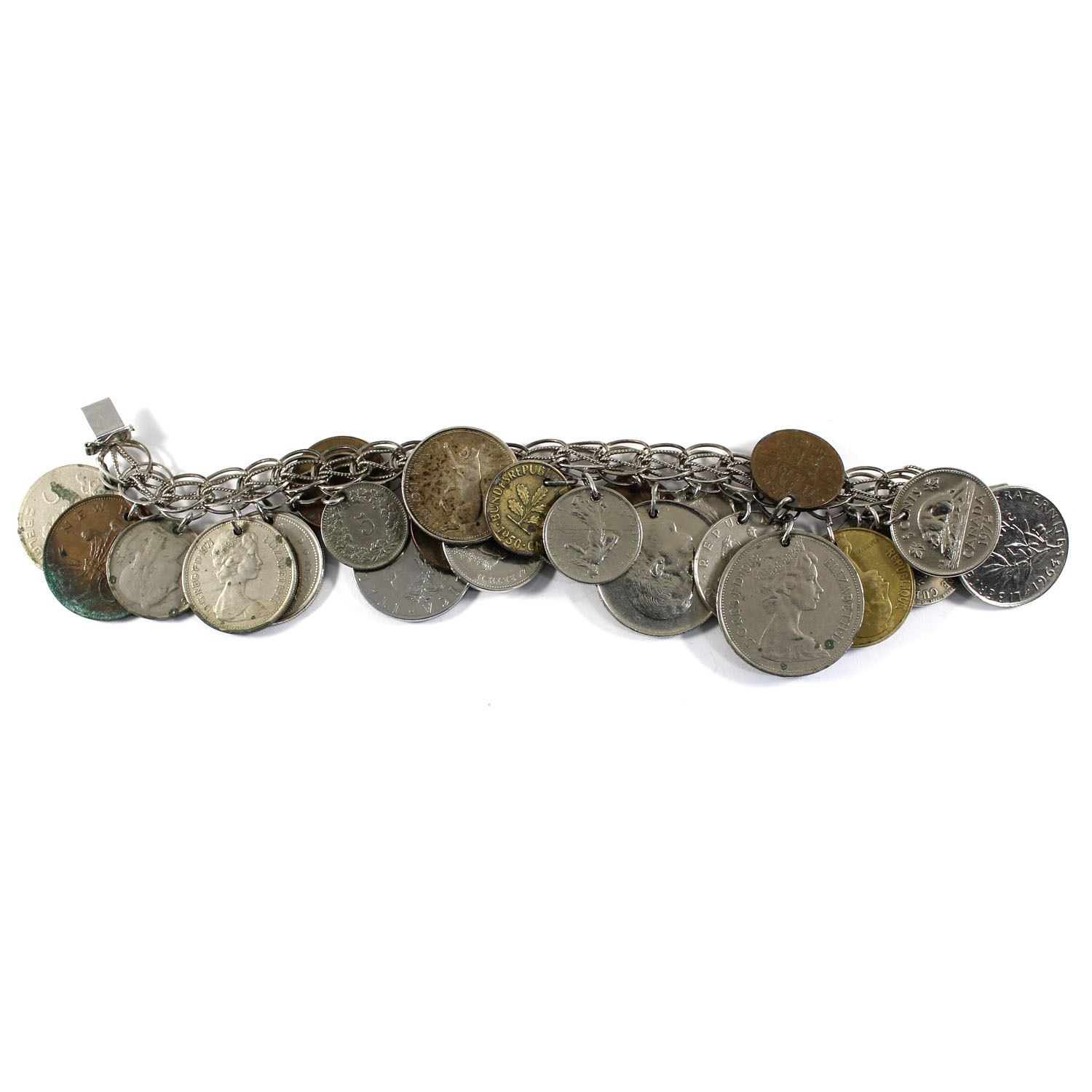 Sterling Silver Bracelet Containing 25 Coins from Around the World Including a Silver 1967 Canada 10-cent & 25-cent.