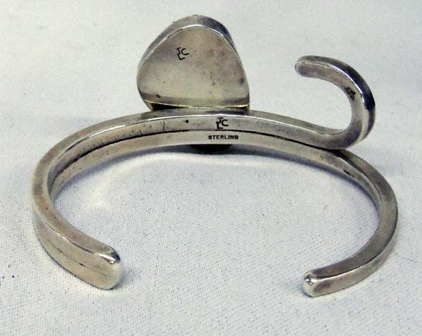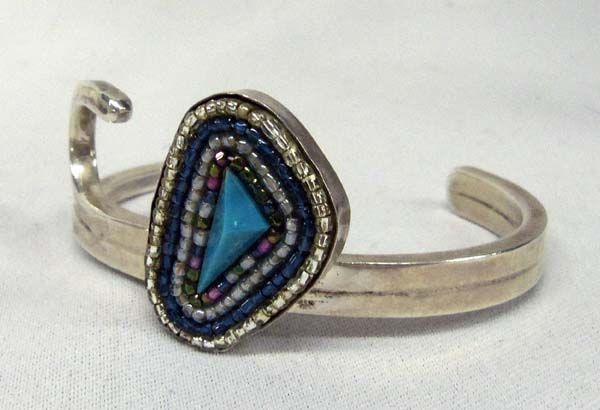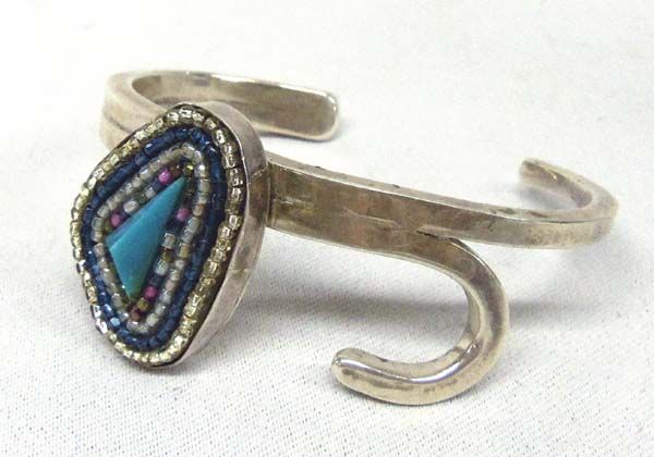 Sterling Silver Bracelet With Beads and Turquoise. Unusual 2 banded bracelet with design focal using foil-lined seed beads in silver, turquoise and pink. Carved turquoise stone in the center completes the design. Measures 5 7/8'', including opening with a width of 1/4''. Center focal measures 1 1/8'' x 3/4''. It is stamped ''Sterling'' with the hallmark of ''JLC''.