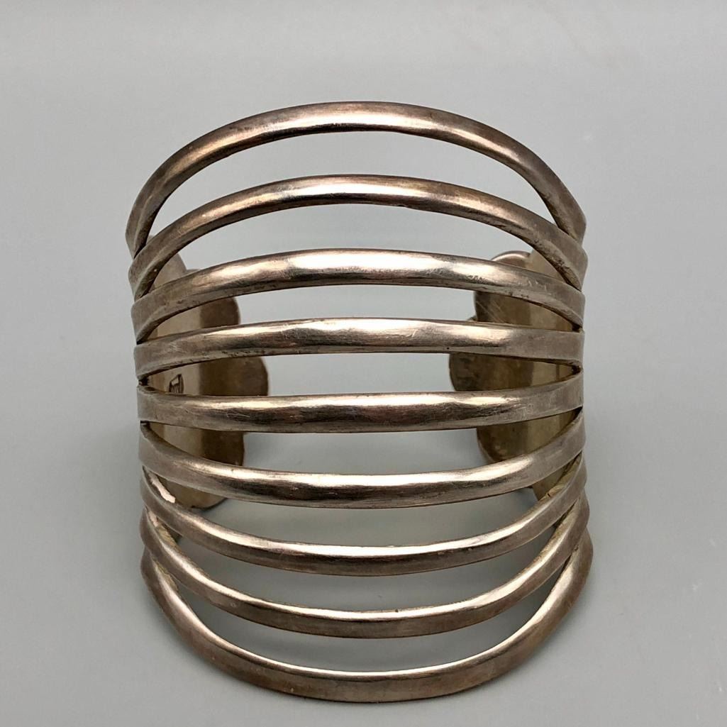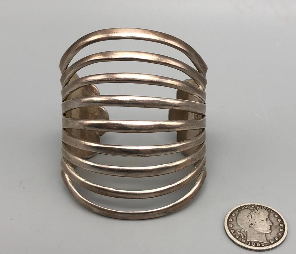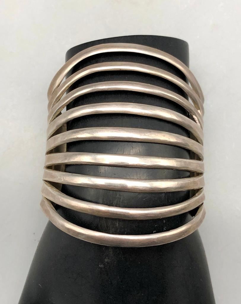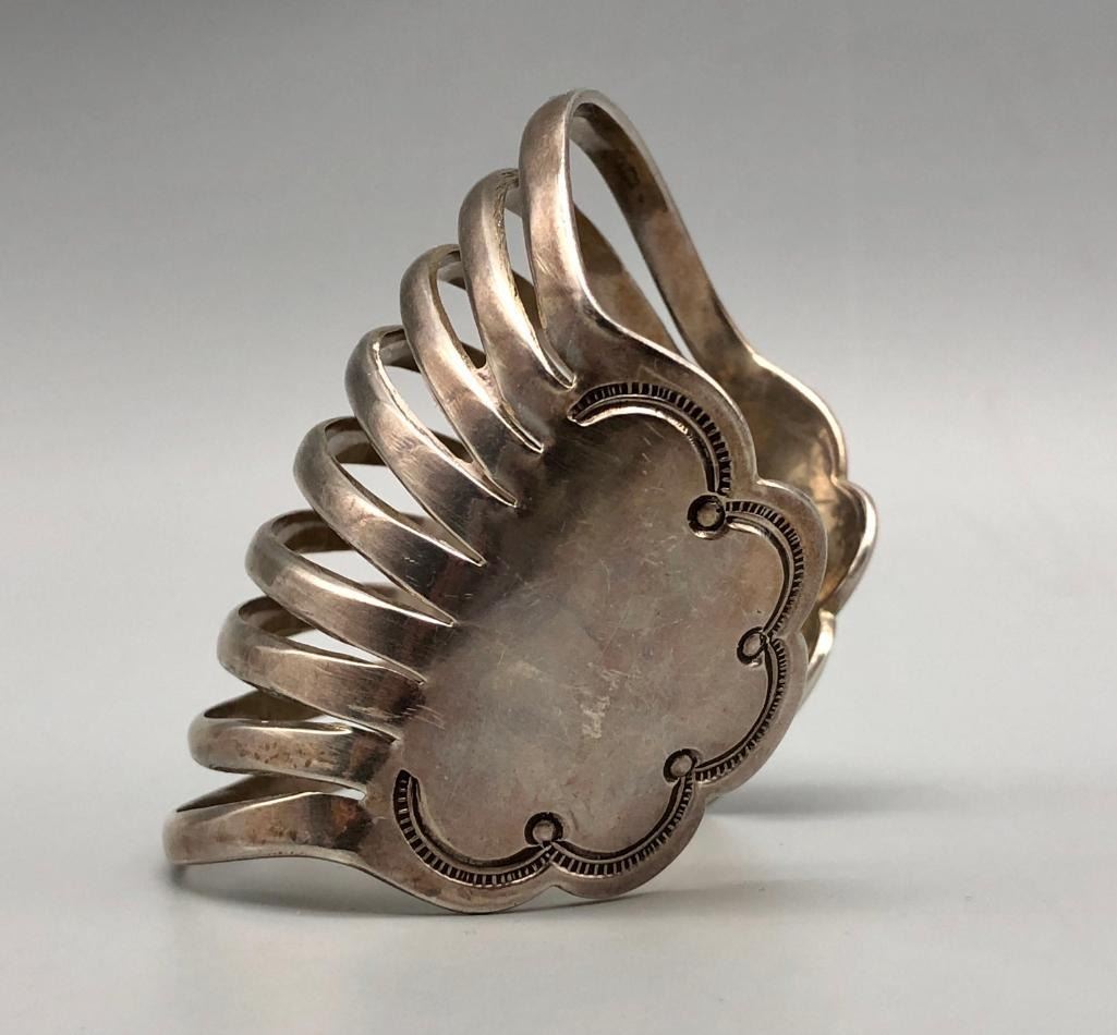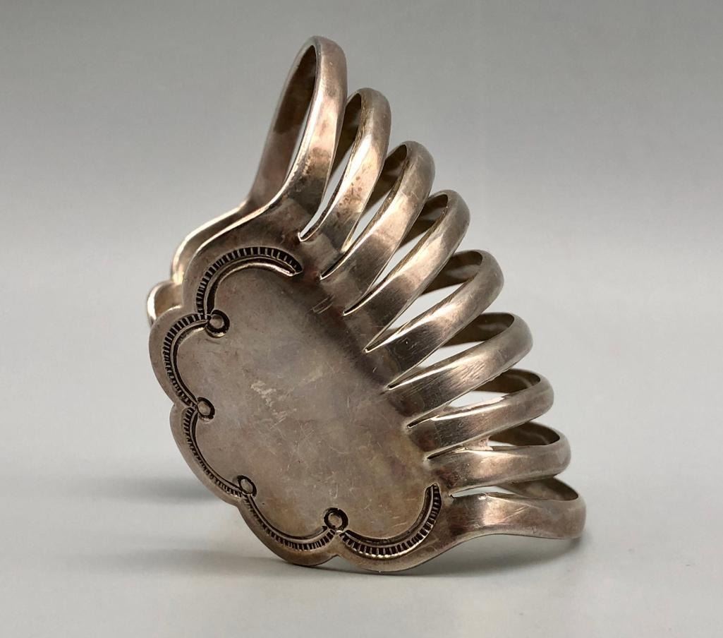 Up for consideration is a beautiful sterling silver bracelet by Debbie Silversmith. This is an elegant, split shank style bracelet with stunning scalloped edges and hand stamped designs. It has a nice weight to it and is made from sterling silver. MAKER: Hallmarked Debbie over a Hogan. Debbie Silversmith (1957-; Navajo). APPROX AGE: Vintage. SIZE: Inside circumference measures 5-3/8 inches long. Opening is an additional 1 inch, fitting a 6-3/8 inch wrist. Width is 2-7/8 inches. Weighs 74.6 grams. CONDITION: Good for its age, normal wear expected. Please look closely at the pictures as they are an important part of our description and are hereby incorporated into the description, specifically with regards to condition. SHIPPING: There will be a $5 handling / packaging fee for shipping this lot. The actual cost of postage will be added on top of that. BUY IT NOW: If you would like to buy this item now, without waiting for the auction day to bid on it, we do offer this option (which is available up to 48 hours before the actual auction starts). The “Buy it Now†price is the high estimate of this lot (plus applicable fees and the Buyer's premium is discounted to 10% when using the Buy it Now option). If you would like to exercise this option, you must contact us by email (or phone as long as you talk to someone live). Reference this lot number and your intention to "Buy it Now."