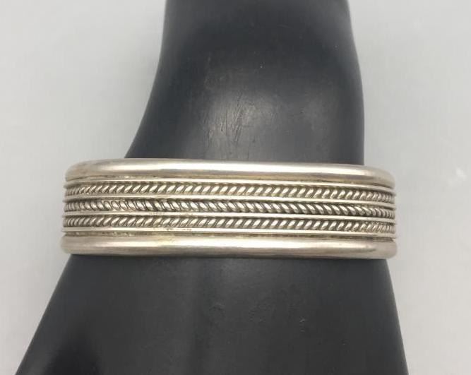 Offered for sale in this lot is a sterling silver bracelet by Tom Hawk. It has a rope like design. Marked as sterling silver. Maker: Tom Hawk, Navajo. Hallmark is partial, but there. Approx. Age: Vintage. Size: Inside circumference measures 5-1/4". Opening is an additional 1-5/8", fitting a 6-7/8" wrist. Width is 7/8". Weighs 46.2 grams. Condition: Good for its age, normal wear expected. Please look closely at the pictures - they are an important part of our description. Shipping: There will be a $5 handling, packaging fee for shipping this lot. The actual cost of postage will be added on top of that.
