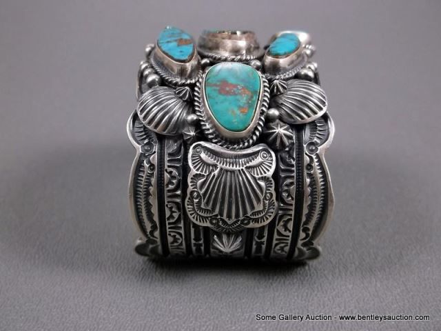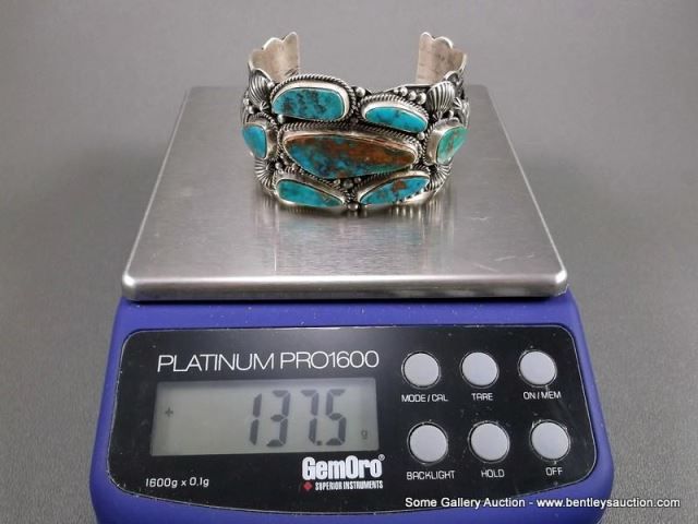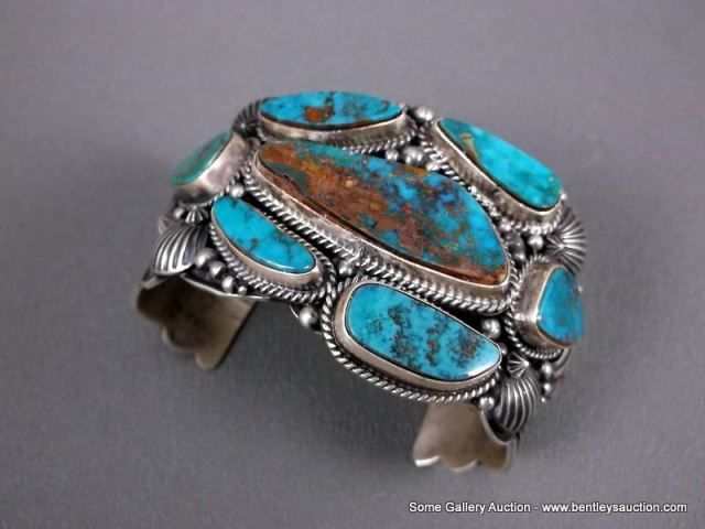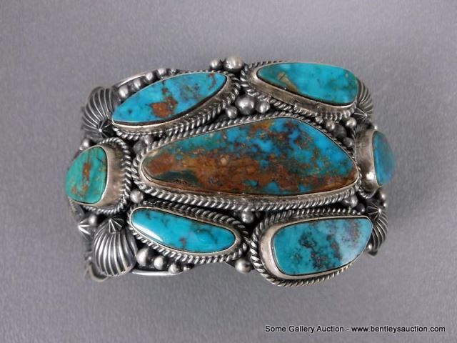 Sterling Silver Bracelet w/ Pilot Mountain Turquoise Stones-Marked Derrick Gordon & Uncle Delbert We