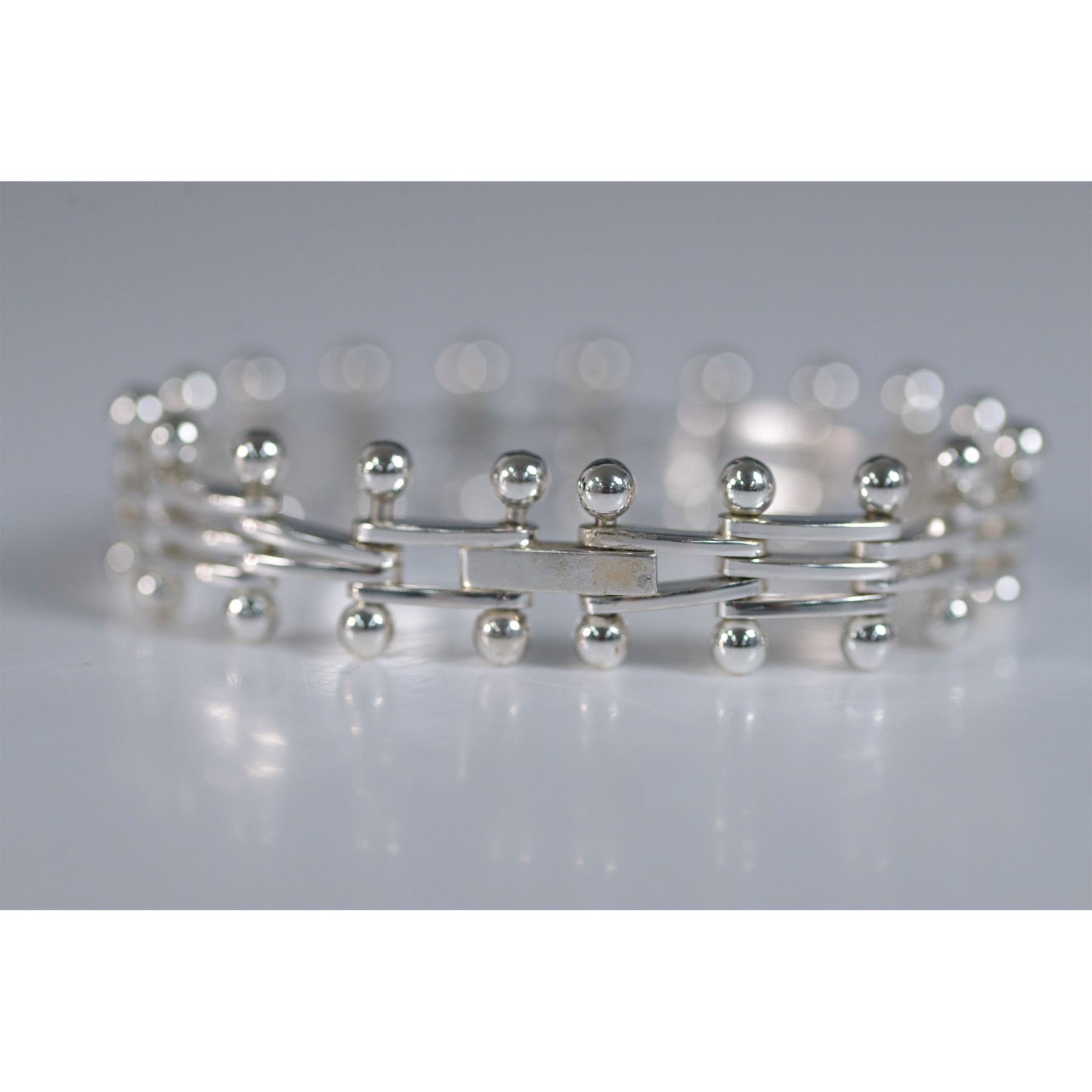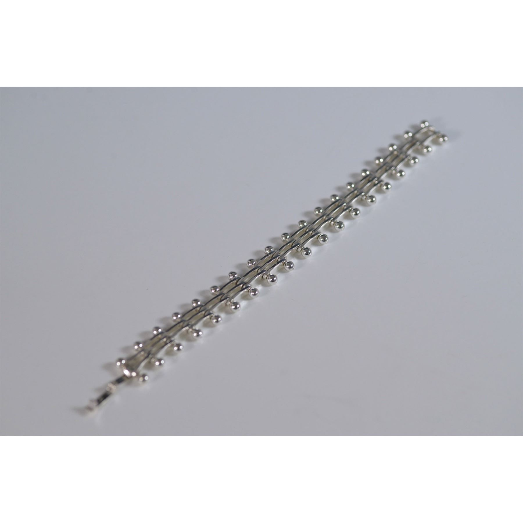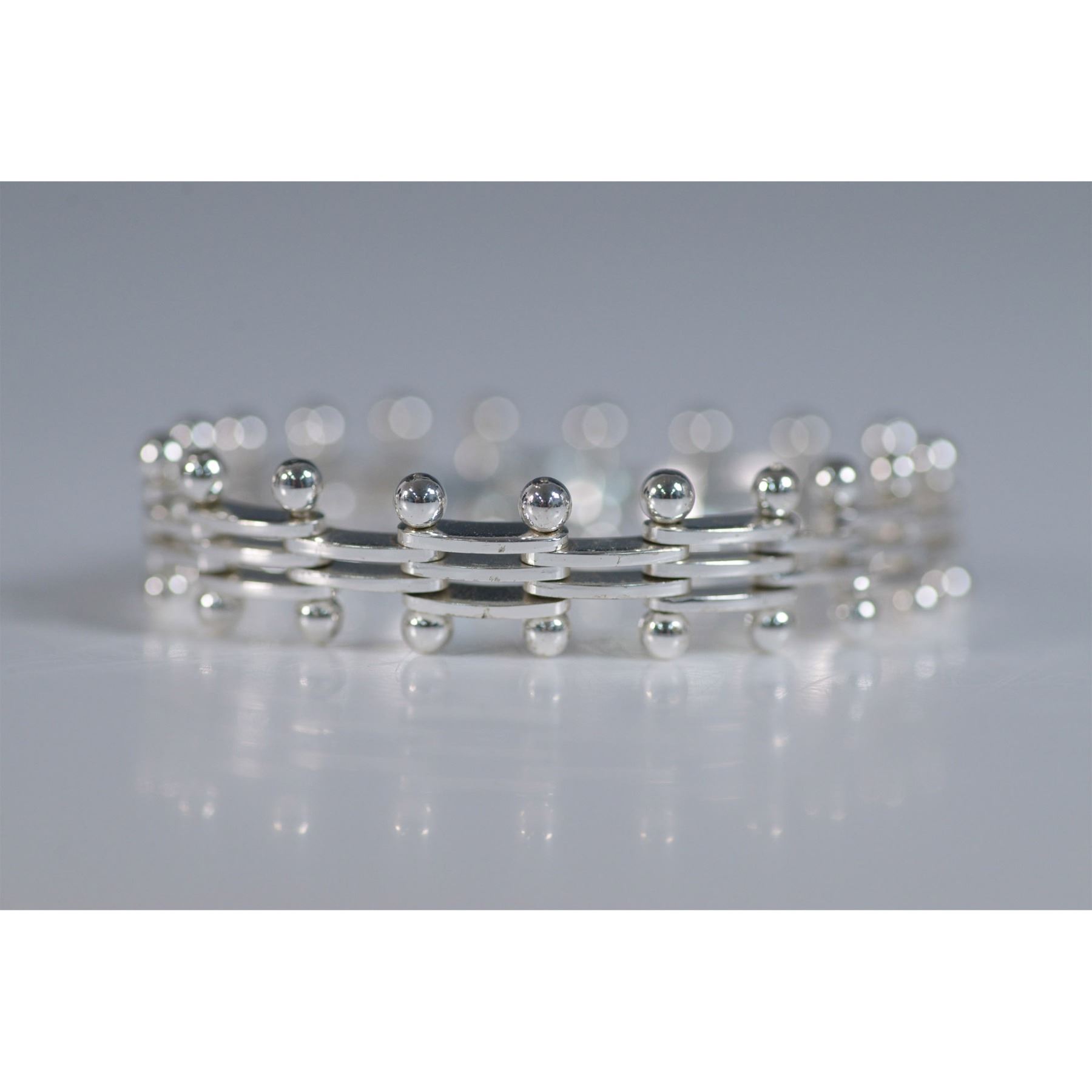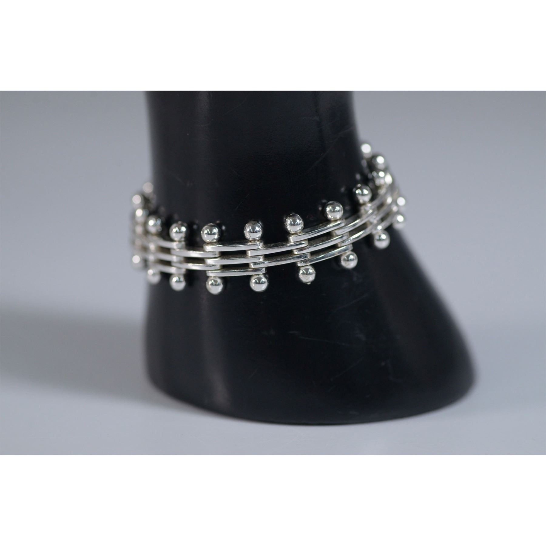 This sterling silver bracelet features an elegant interwoven design accented with decorative beads. It measures 7.5"L and weighs 32 grams. A sophisticated addition to any jewelry collection, this bracelet showcases craftsmanship and versatile styling.
