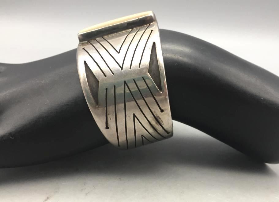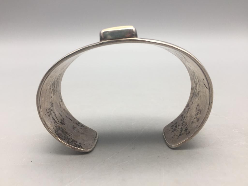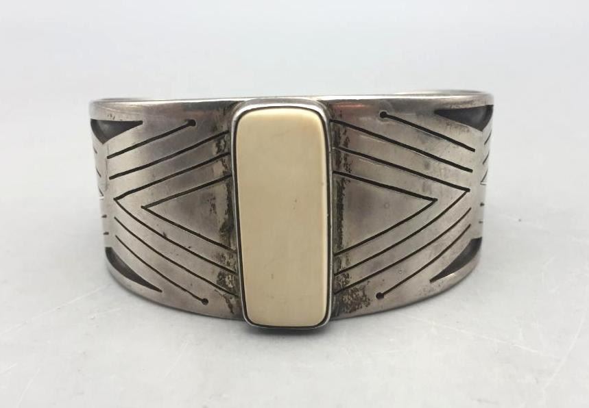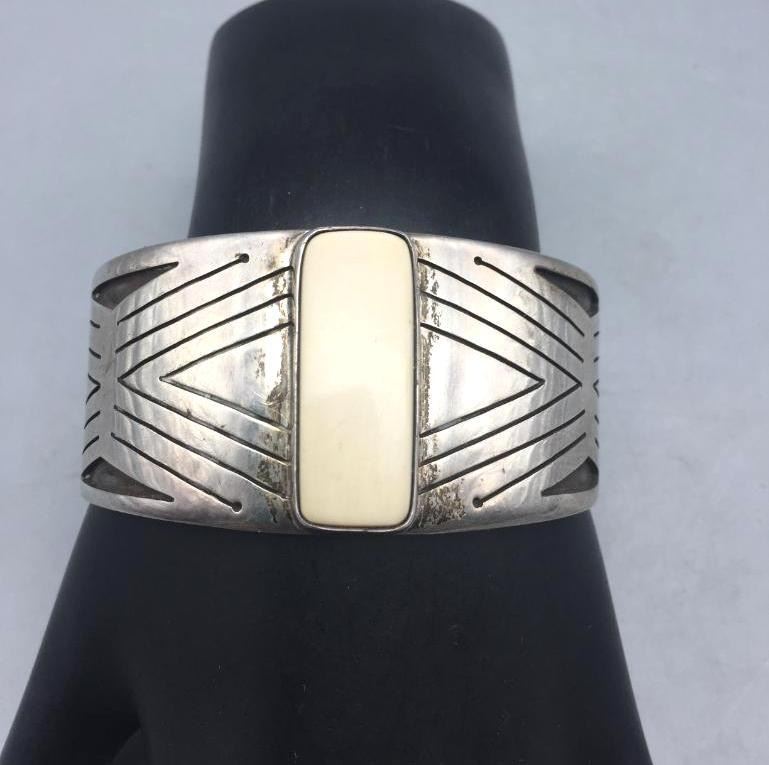 Presented for sale in this lot is a vintage sterling silver bracelet with an ivory setting. It is accented with an overlay design. Marked as sterling silver. Maker: Hallmarked with 2 corn stalks. Approx. Age: Vintage. Size: Inside circumference measures 5-3/8". Opening is an additional 1-1/8", fitting a 6-1/2" wrist. Width is 1-1/4". Weighs 59.7 grams. Condition: Good for its age, normal wear expected. Please look closely at the pictures - they are an important part of our description. Shipping: There will be a $5 handling, packaging fee for shipping this lot. The actual cost of postage will be added on top of that.
