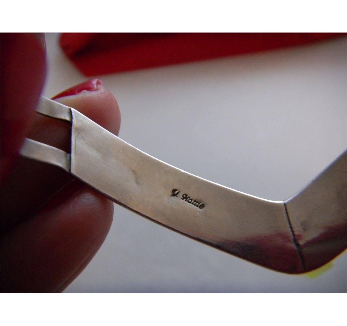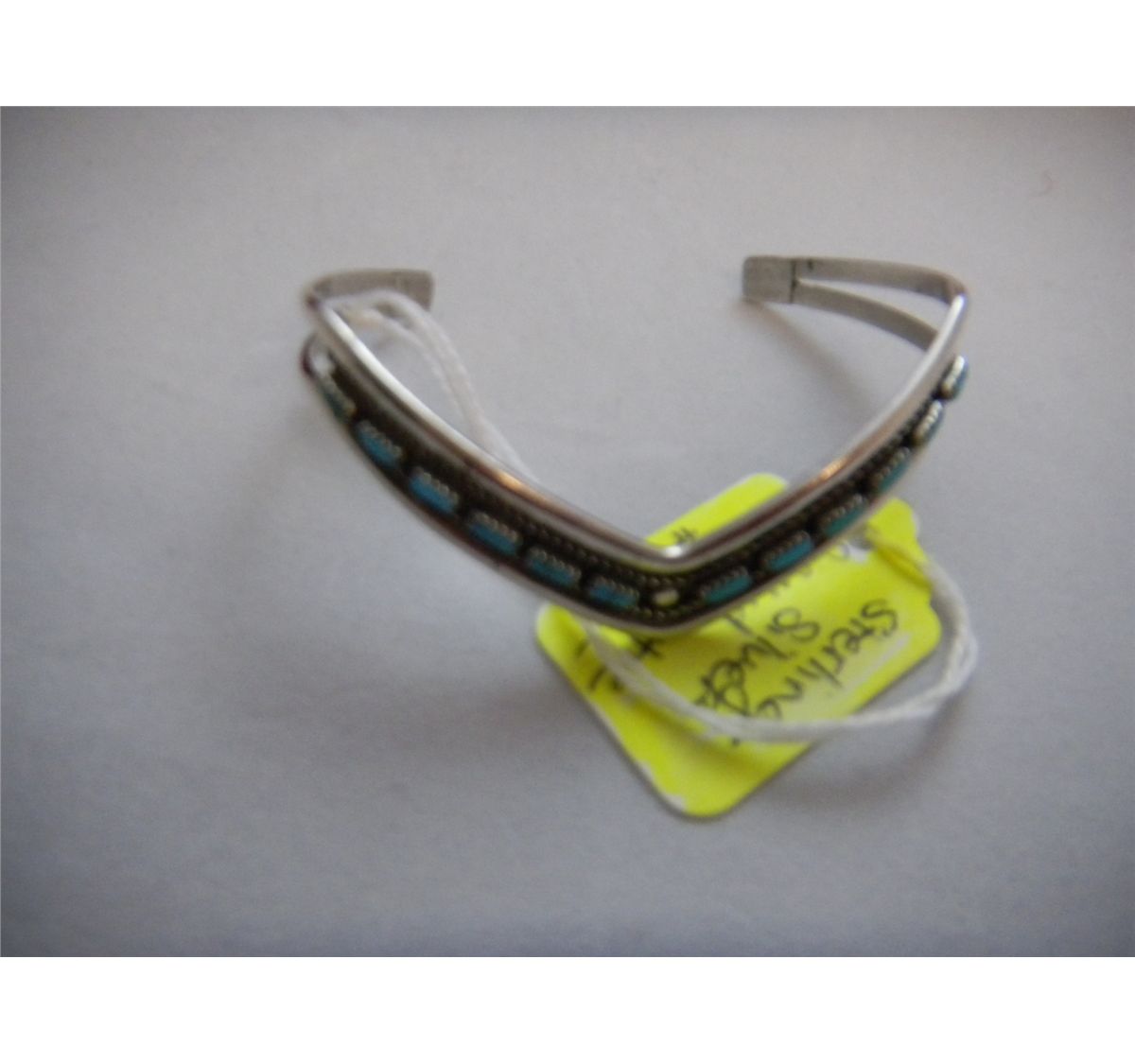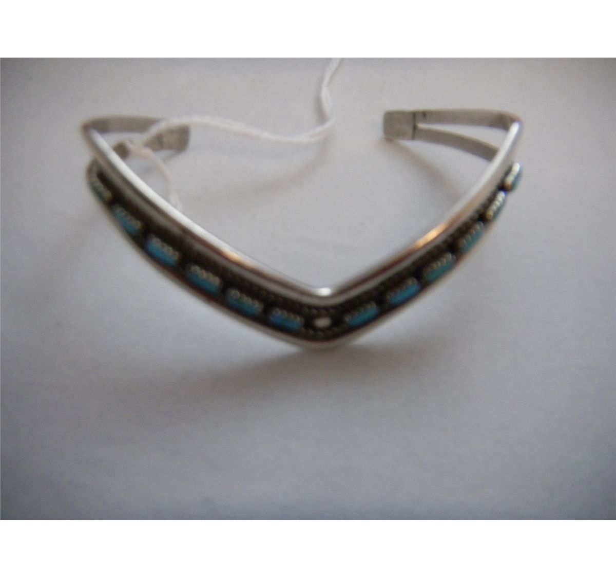 Sterling Silver Bracelet signed V. Mattie. Bracelet is in a chevron shape and has twelve matched turquoise stones. 1960. Shipping $10.00. The weight of the bracelet is 11.4 grams.