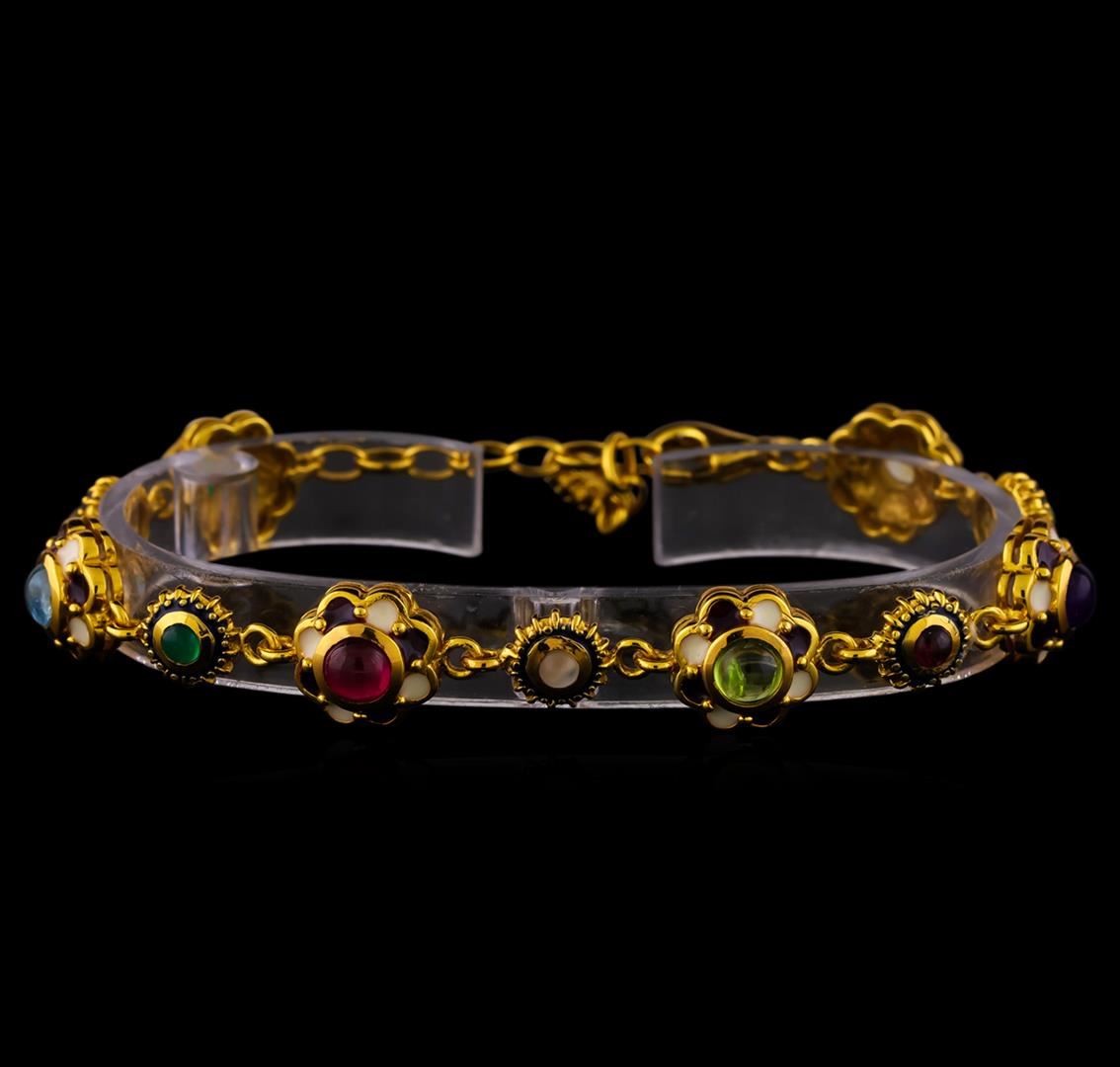 One of a kind high fashion sterling silver Bracelet weighing 16.8 grams. Containing: Ruby, Amethyst, Tourmaline, Green Crystal, Red and White Enamel Inlay. This sterling silver promises a lasting shine.