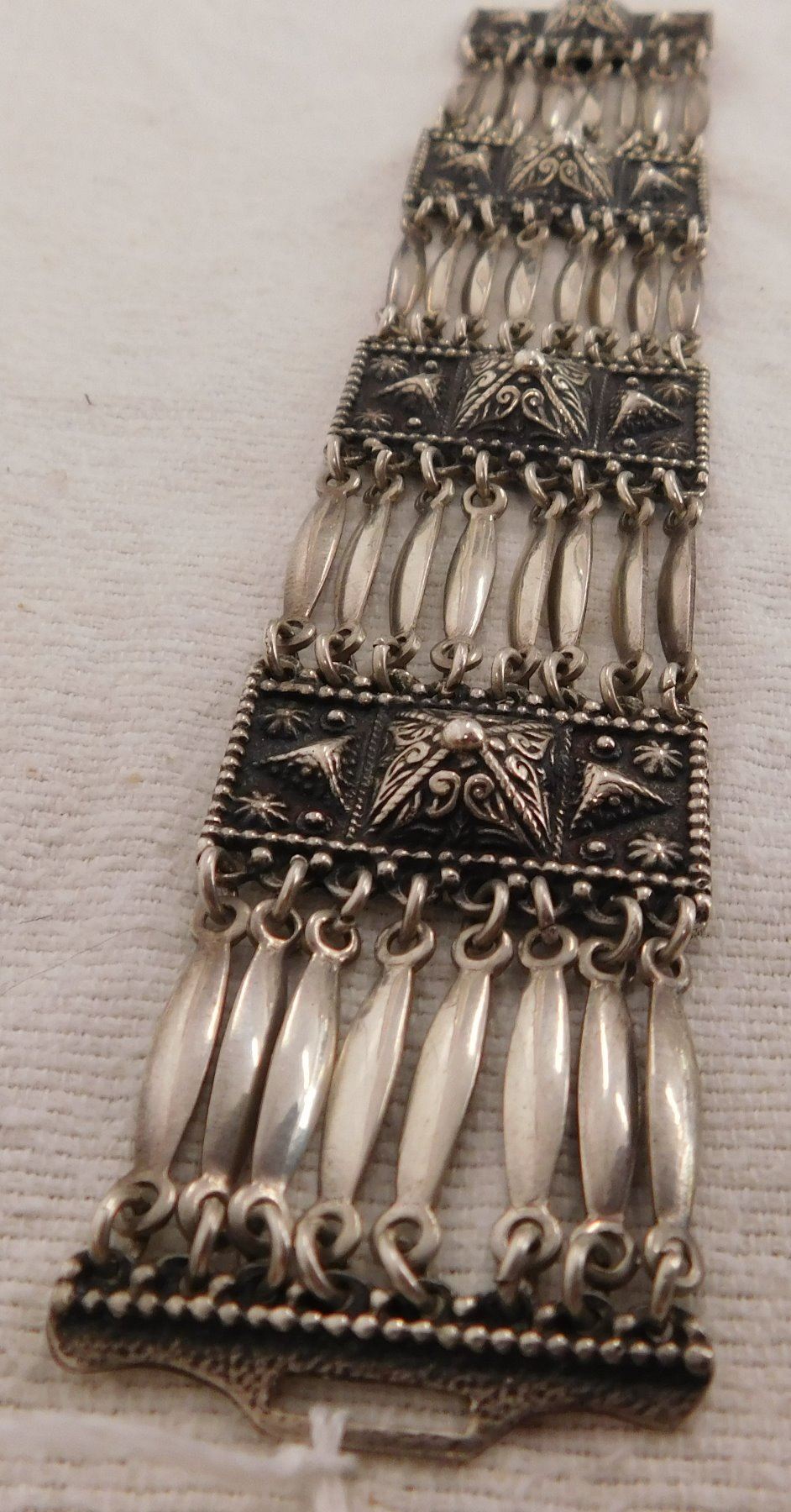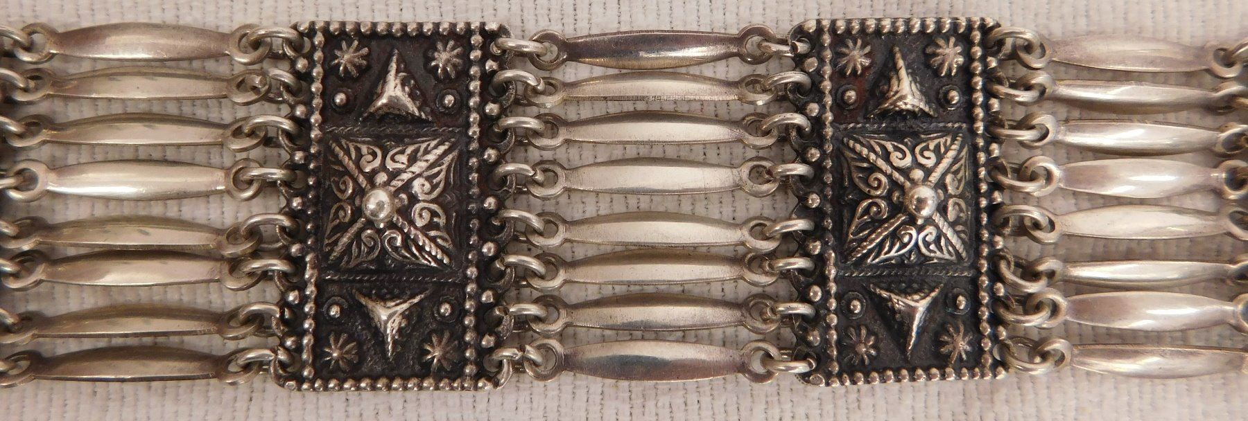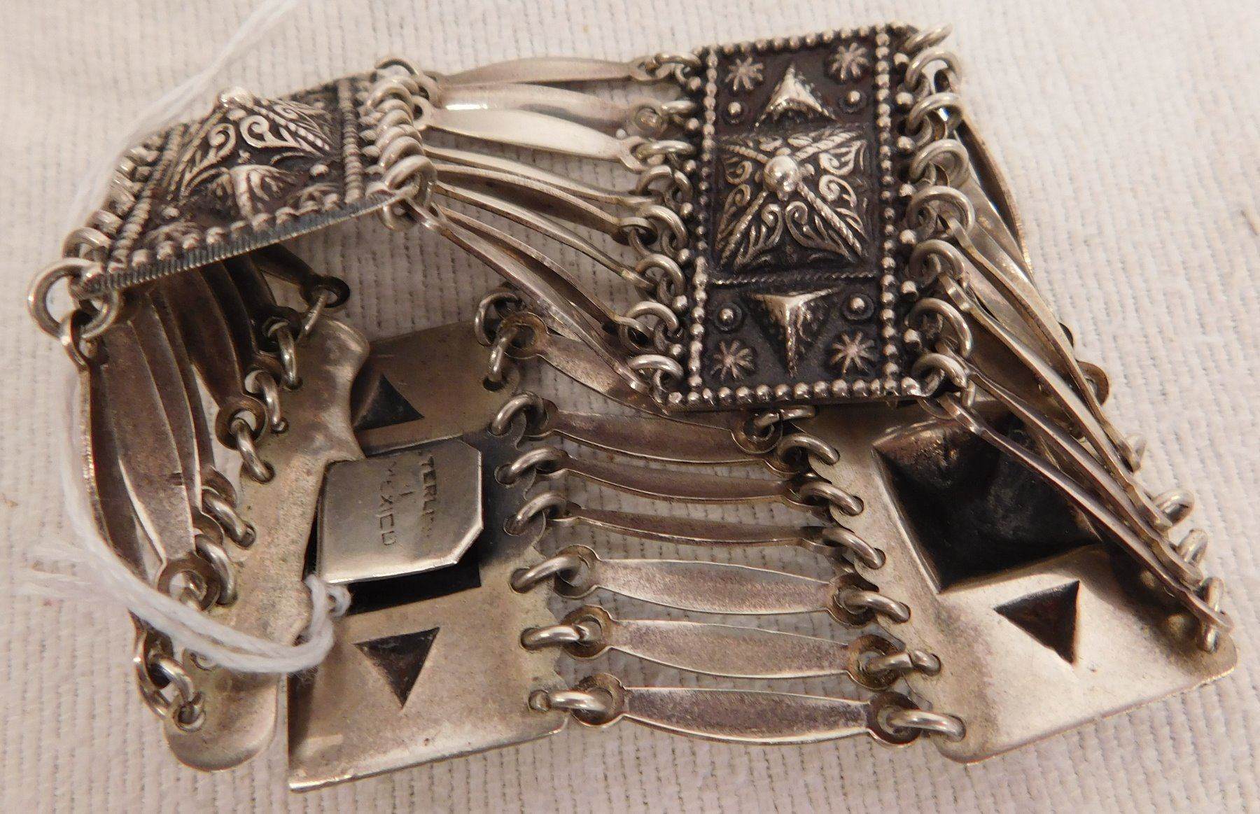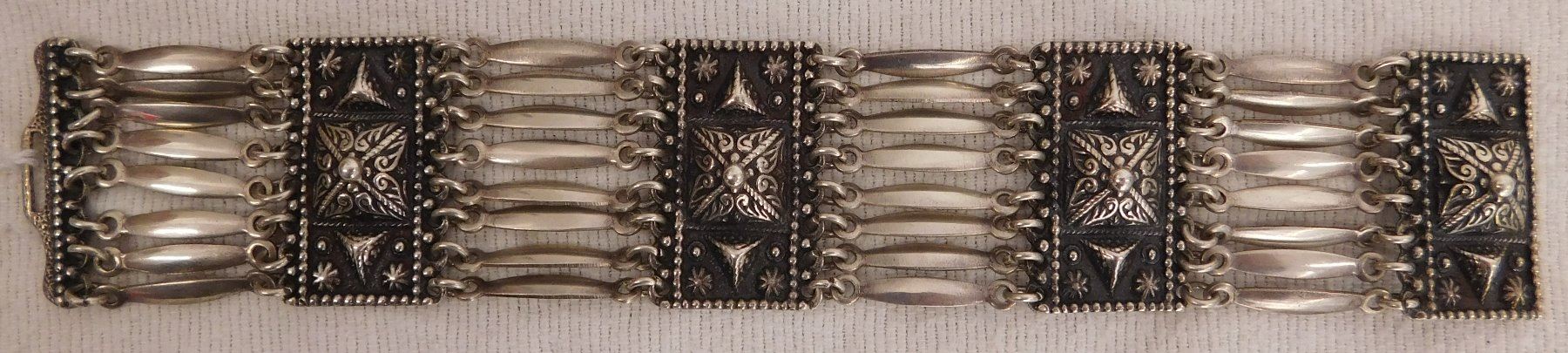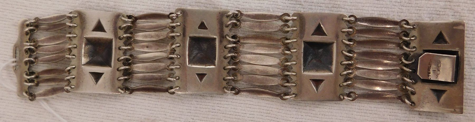 Sterling Silver Bracelet, circa 1950s. Made of sterling silver, the item measures 7.5" x 1.5". Marked Sterling, Mexico. Beautiful, fancy design with interesting clasp-action. Weighs approx. 65.8 grams. Condition: Very good, see images. Shipping: $12.50 w/insurance and signature.