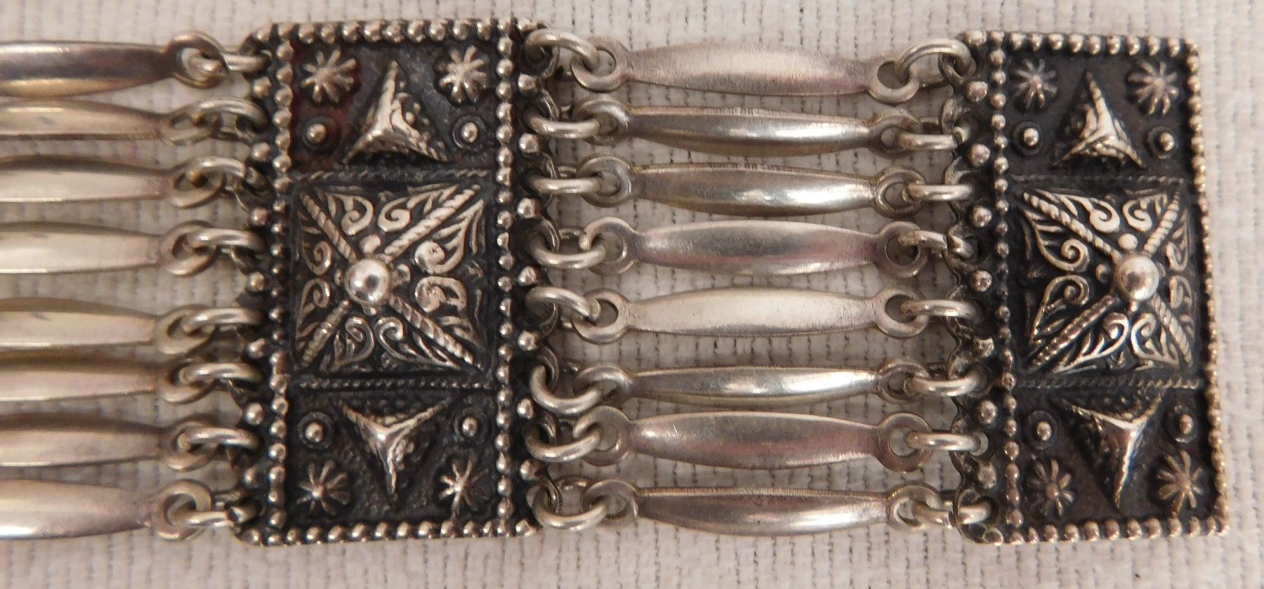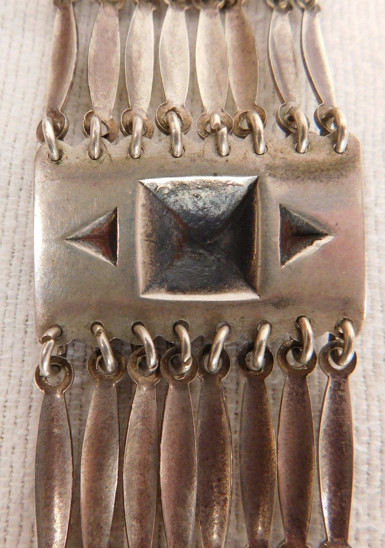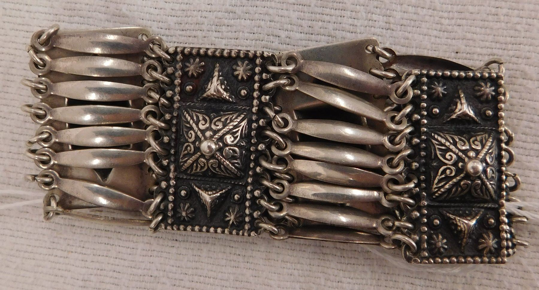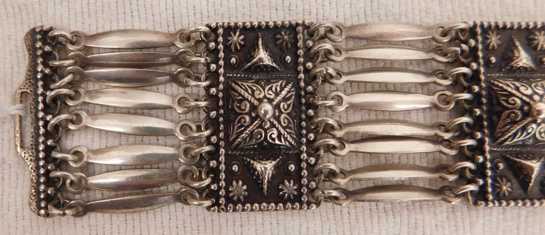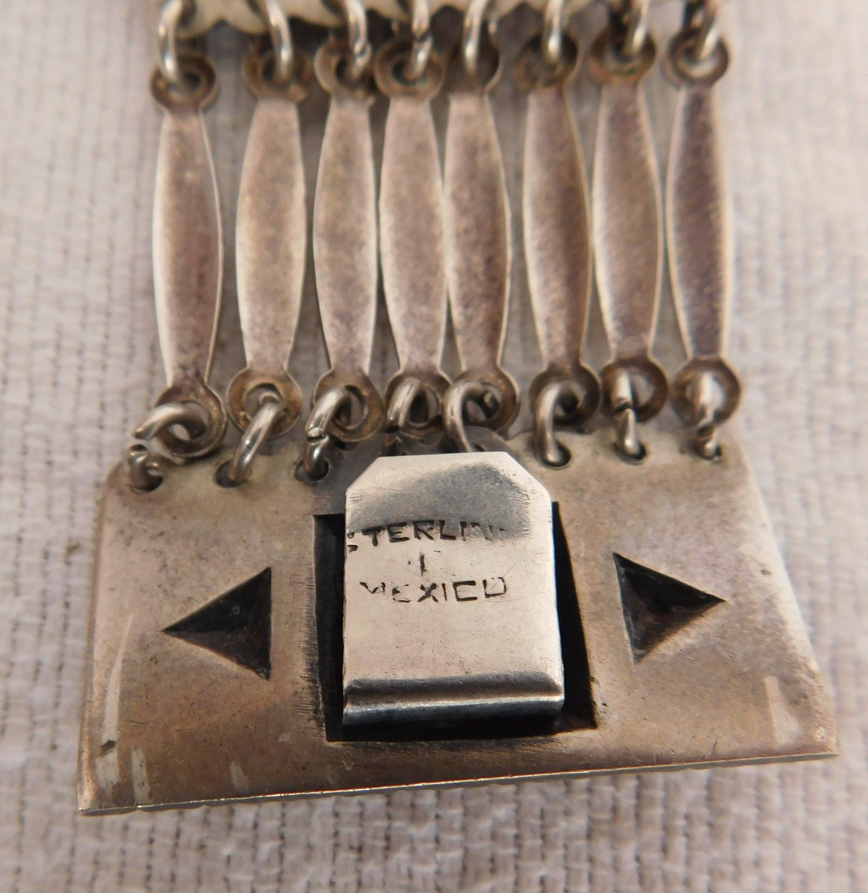 Sterling Silver Bracelet, circa 1950s. Made of sterling silver, the item measures 7.5" x 1.5". Marked Sterling, Mexico. Beautiful, fancy design with interesting clasp-action. Weighs approx. 65.8 grams. Condition: Very good, see images. Shipping: $12.50 w/insurance and signature.