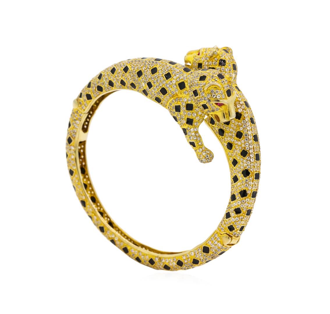 One of a kind high fashion sterling silver bracelet weighing 43 grams. Containing: Cubic Zirconia, Created Ruby, Black Enamel. This sterling silver promises a lasting shine.
