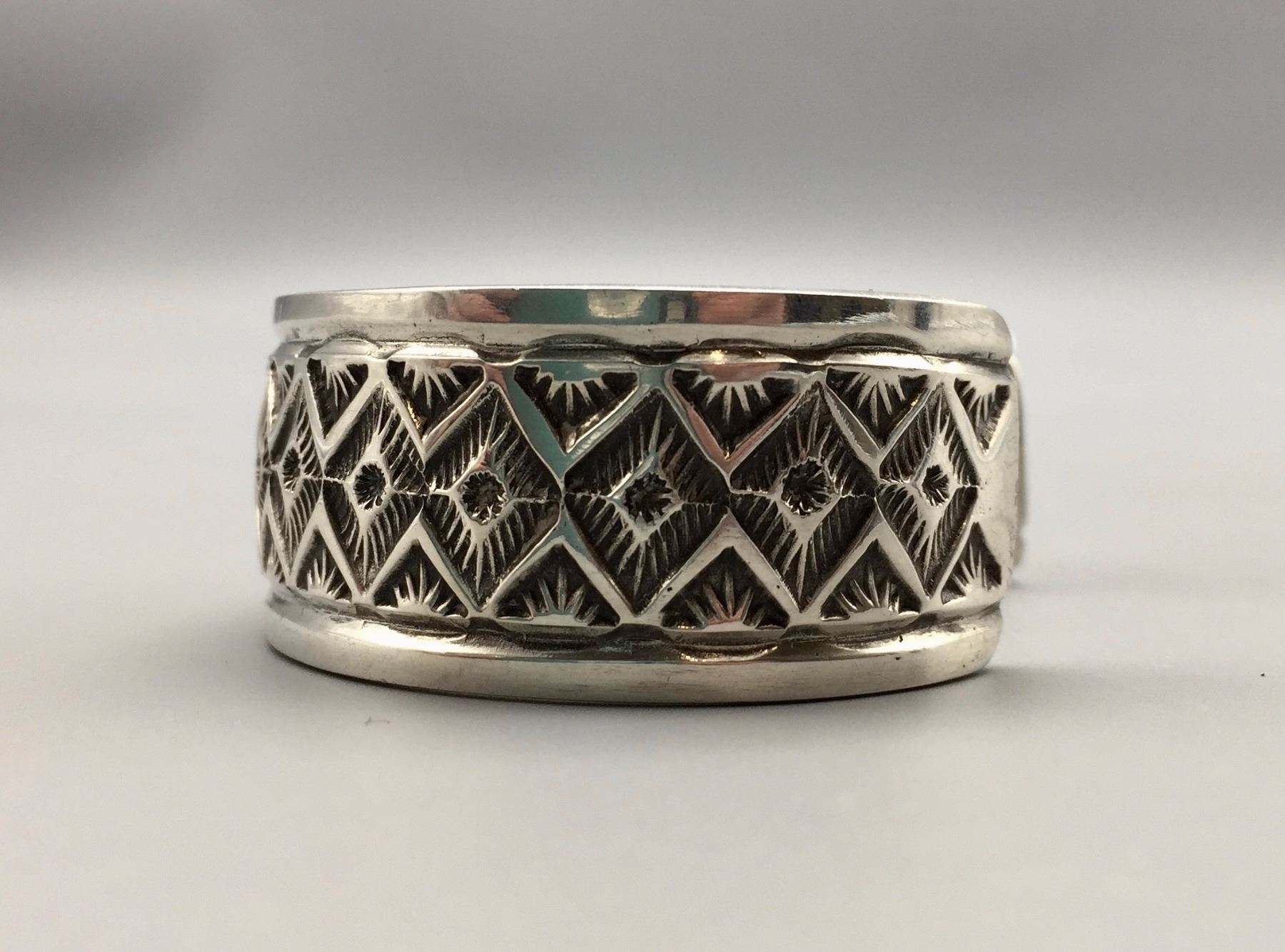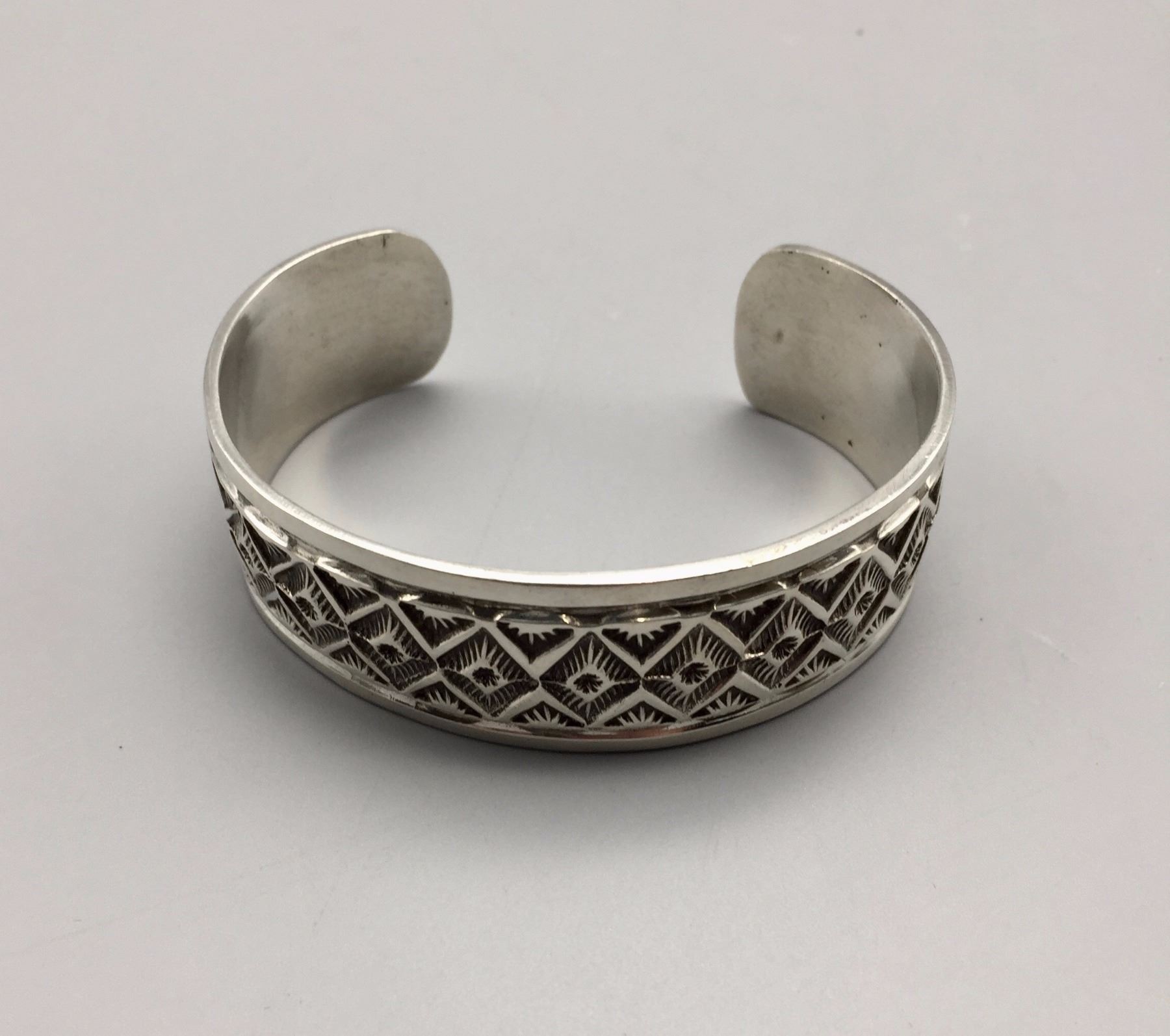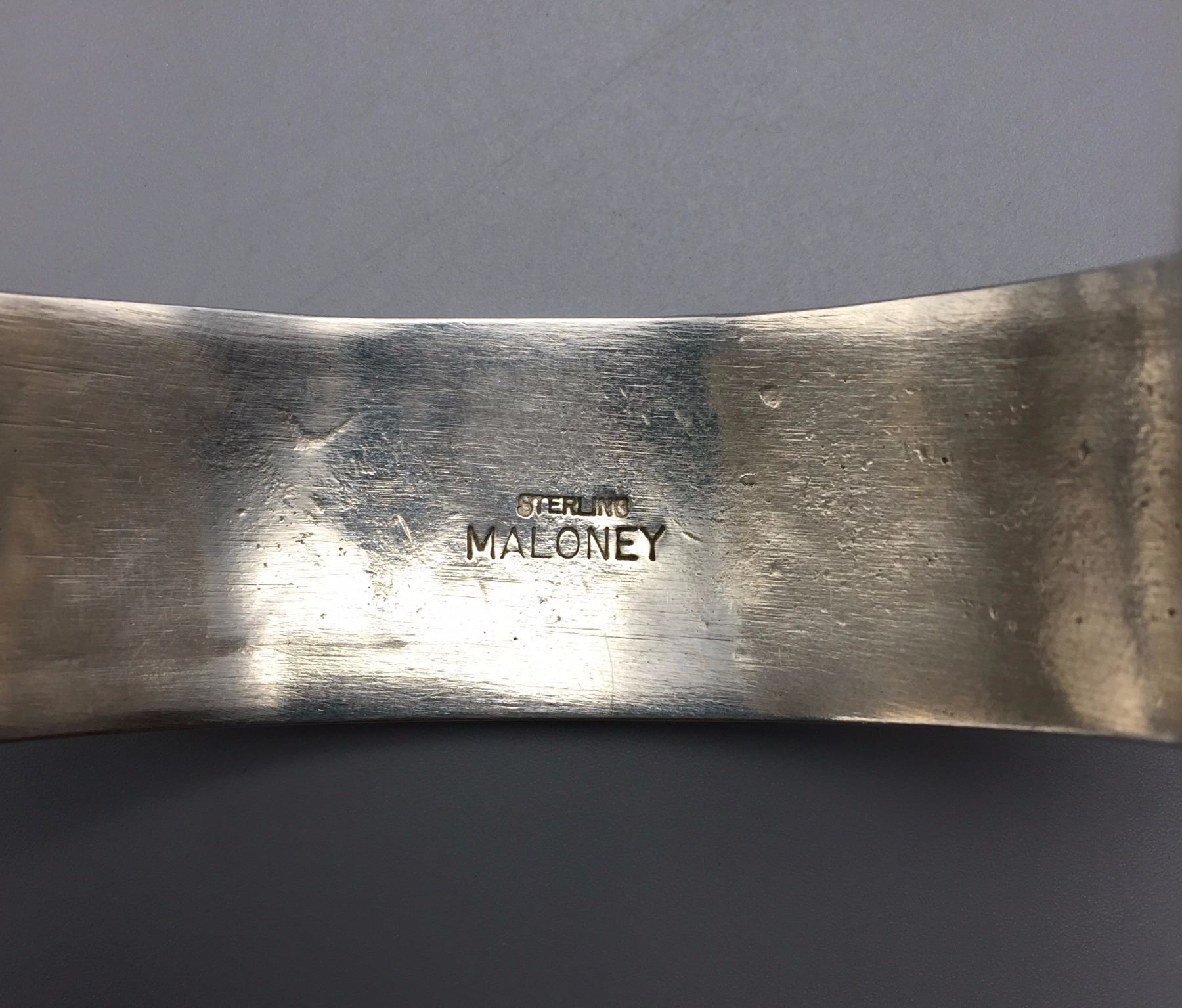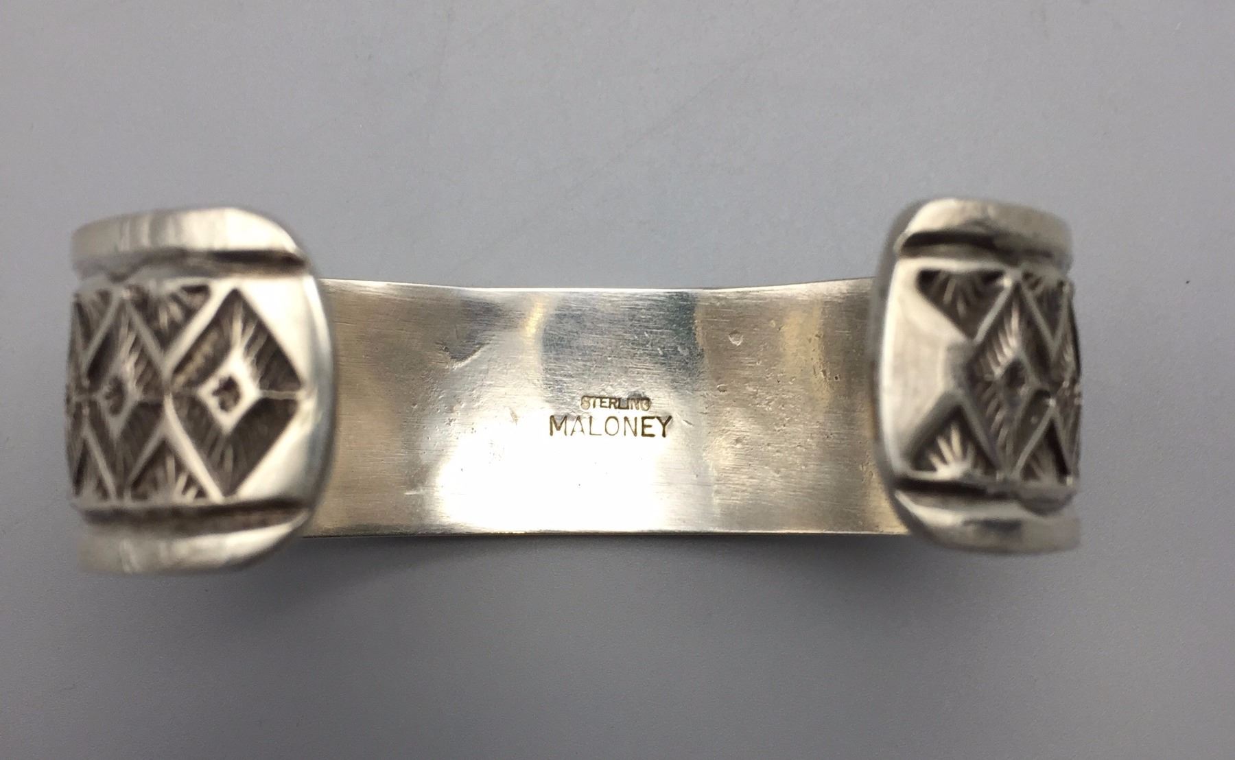 Maker: Hallmarked MALONEY, mark of Freddie Maloney, Navajo. Approx. Age: Fairly modern. Size: Inside circumference is 6 1/4” with an additional 1 1/4” opening (fits 7 1/2” wrist). 7/8” wide and weighs 49.8 g. Additional Info: Hand-stamped sterling silver cuff bracelet. Condition: Good, normal wear expected. Please look closely at the pictures - they are an important part of our description. Shipping: There will be a $5 handling / packaging fee for shipping this lot. The actual cost of postage will be added on top of that.