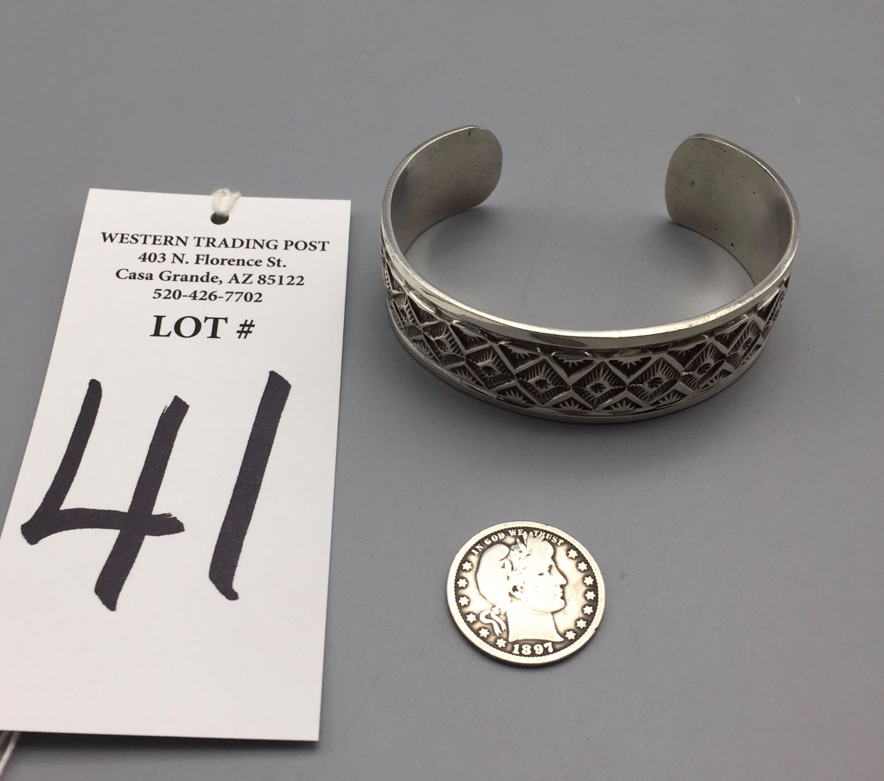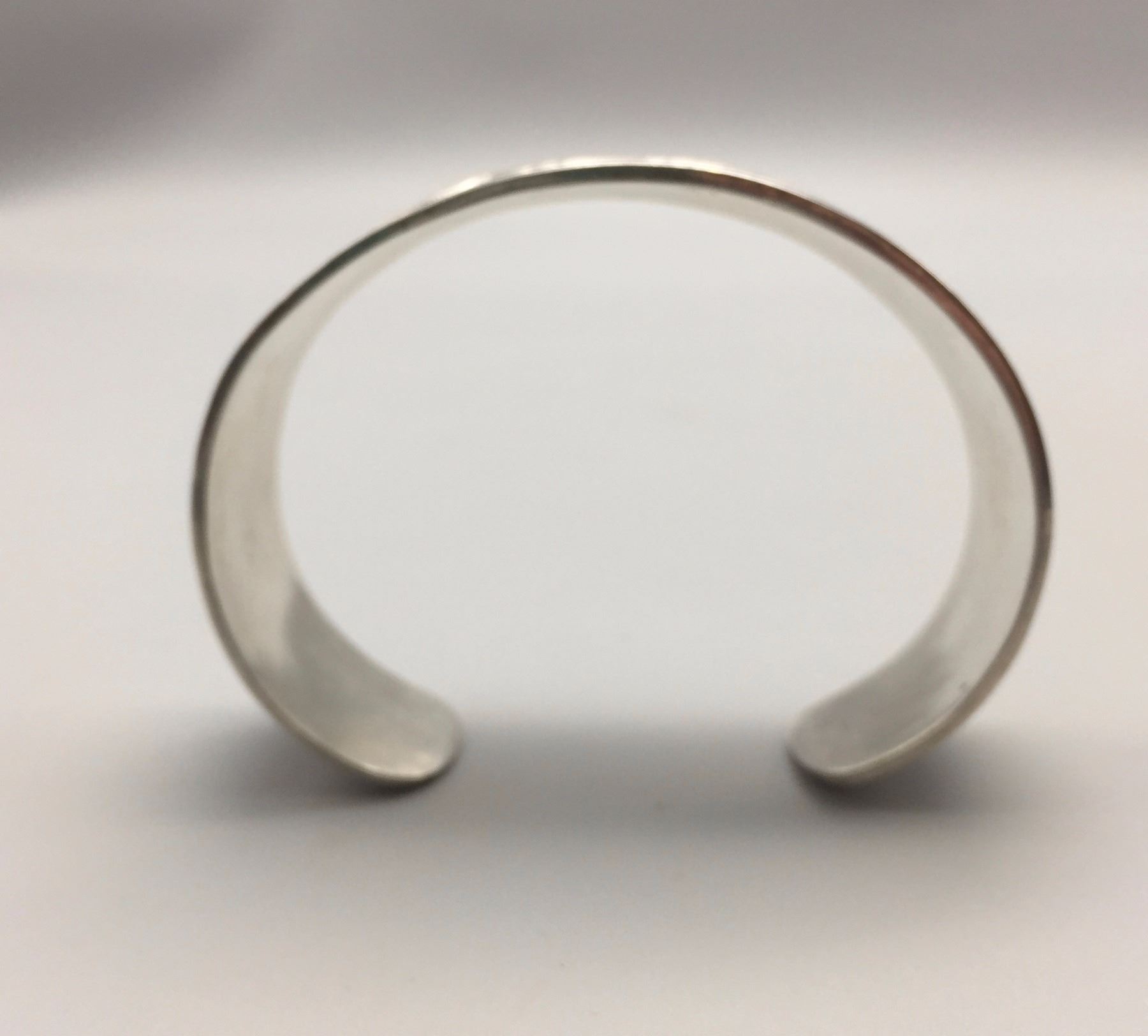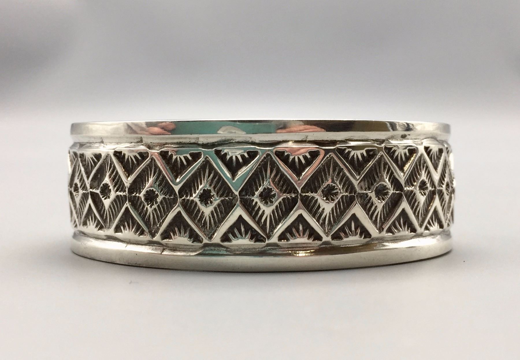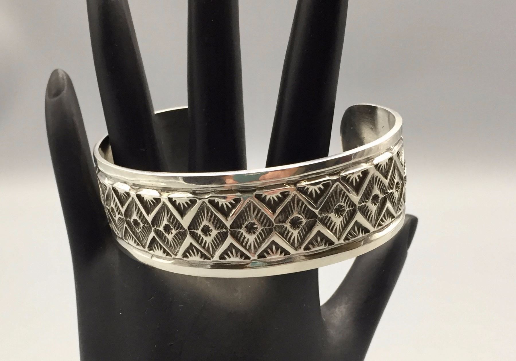 Maker: Hallmarked MALONEY, mark of Freddie Maloney, Navajo. Approx. Age: Fairly modern. Size: Inside circumference is 6 1/4” with an additional 1 1/4” opening (fits 7 1/2” wrist). 7/8” wide and weighs 49.8 g. Additional Info: Hand-stamped sterling silver cuff bracelet. Condition: Good, normal wear expected. Please look closely at the pictures - they are an important part of our description. Shipping: There will be a $5 handling / packaging fee for shipping this lot. The actual cost of postage will be added on top of that.