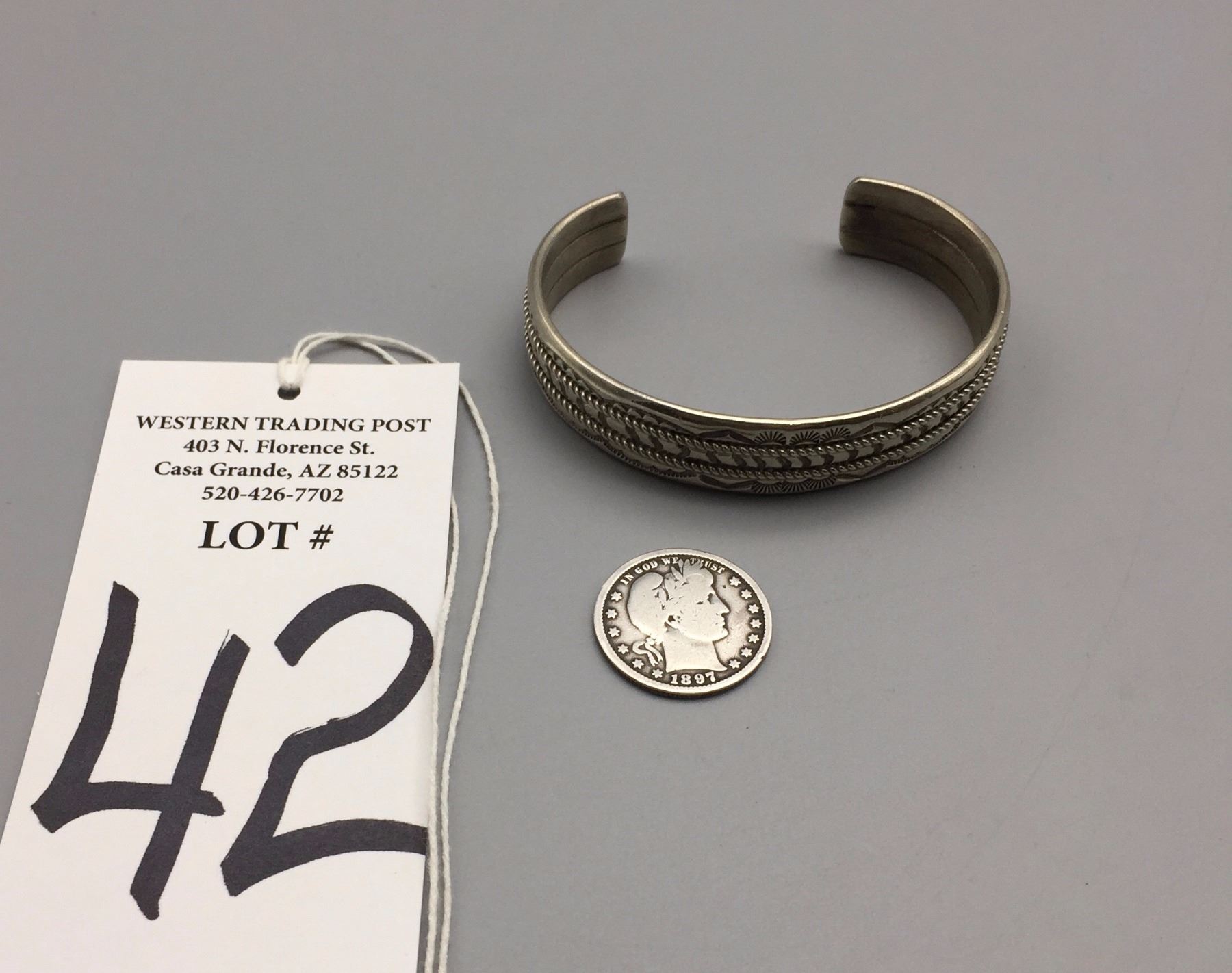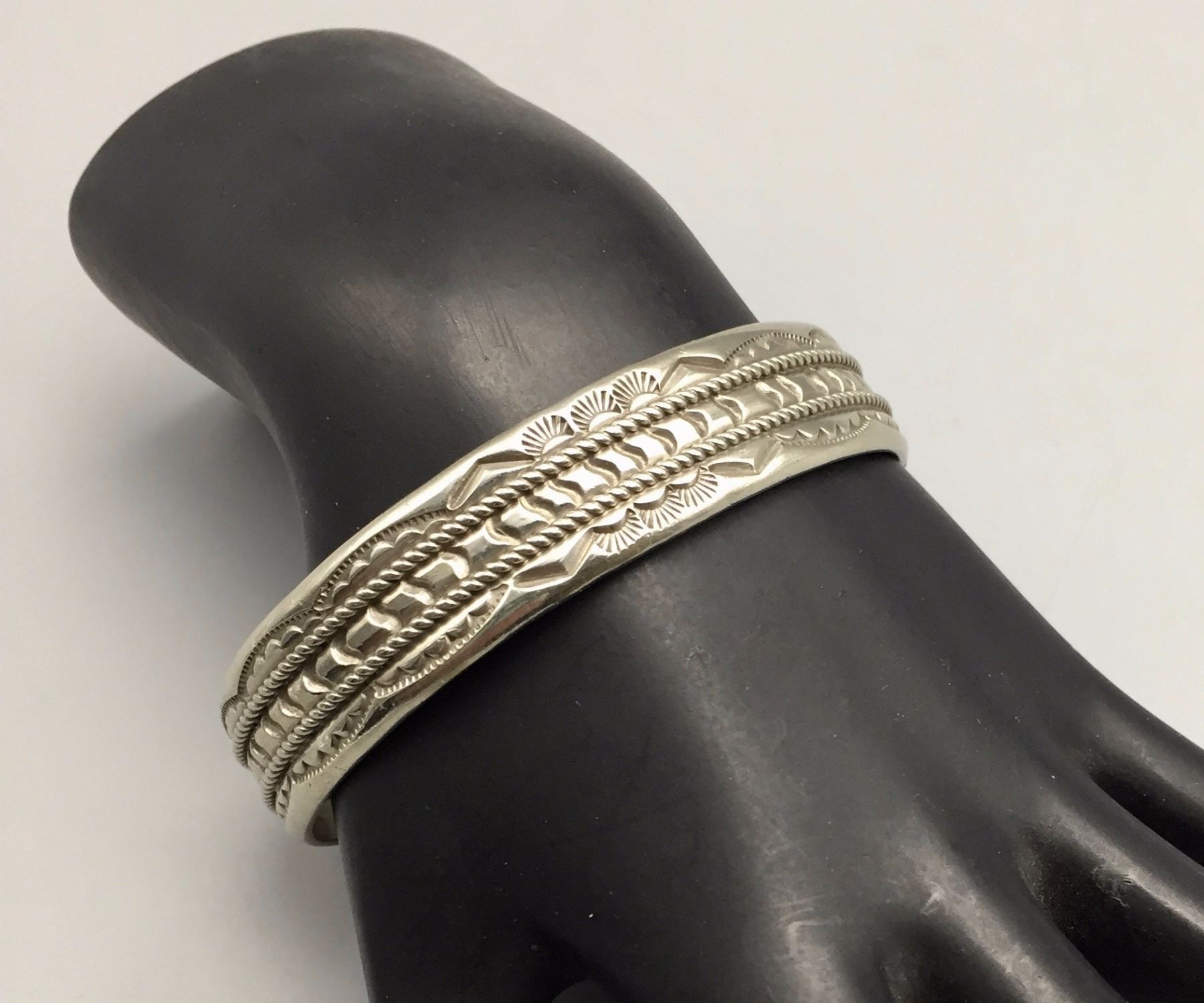 Maker: Hallmarked EK. Possibly Anthony (Elmer) Kee, Navajo. Approx. Age: Circa 1980s. Size: Inside circumference is 5 7/8” with an additional 1 1/4” opening (fits 7 1/8” wrist). About 1/2” wide and weighs 44.5 g. Additional Info: Hand-stamped/hand-embellished sterling silver cuff bracelet. Condition: Good, normal wear expected. Please look closely at the pictures - they are an important part of our description. Shipping: There will be a $5 handling / packaging fee for shipping this lot. The actual cost of postage will be added on top of that.