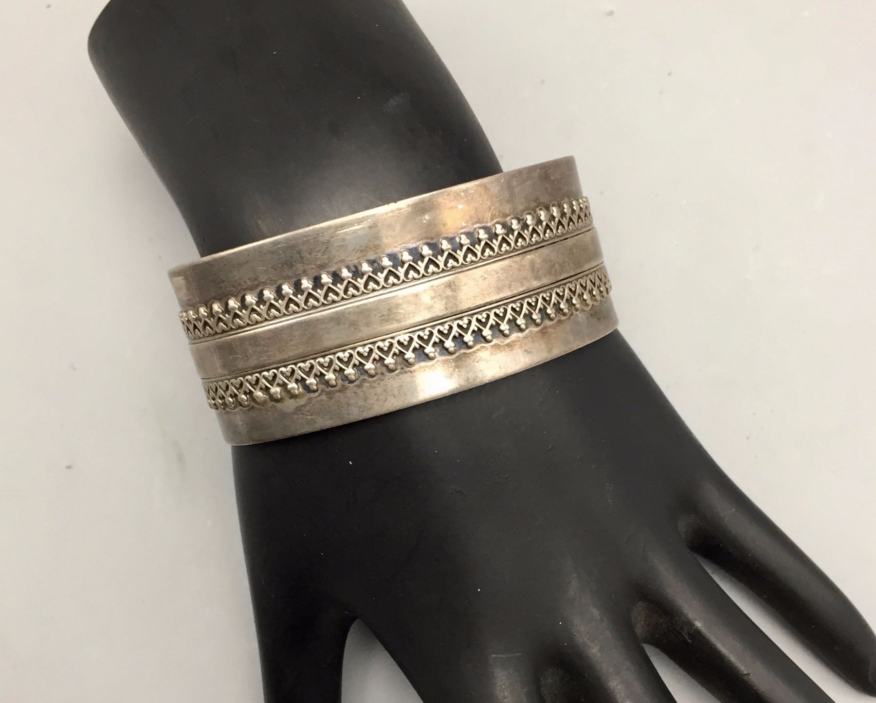 Maker: Unknown. Approx. Fairly modern. Size: Inside circumference 5 1/2” with an additional 1” opening (fits a 6 1/2” wrist). 1” wide and weighs 48.8 g. Additional Info: Sterling silver overlay bracelet. Condition: Good for their age, normal wear expected. New, old stock (NOS). Please look closely at the pictures - they are an important part of our description. Shipping: There will be a $5 handling / packaging fee for shipping this lot. The actual cost of postage will be added on top of that.