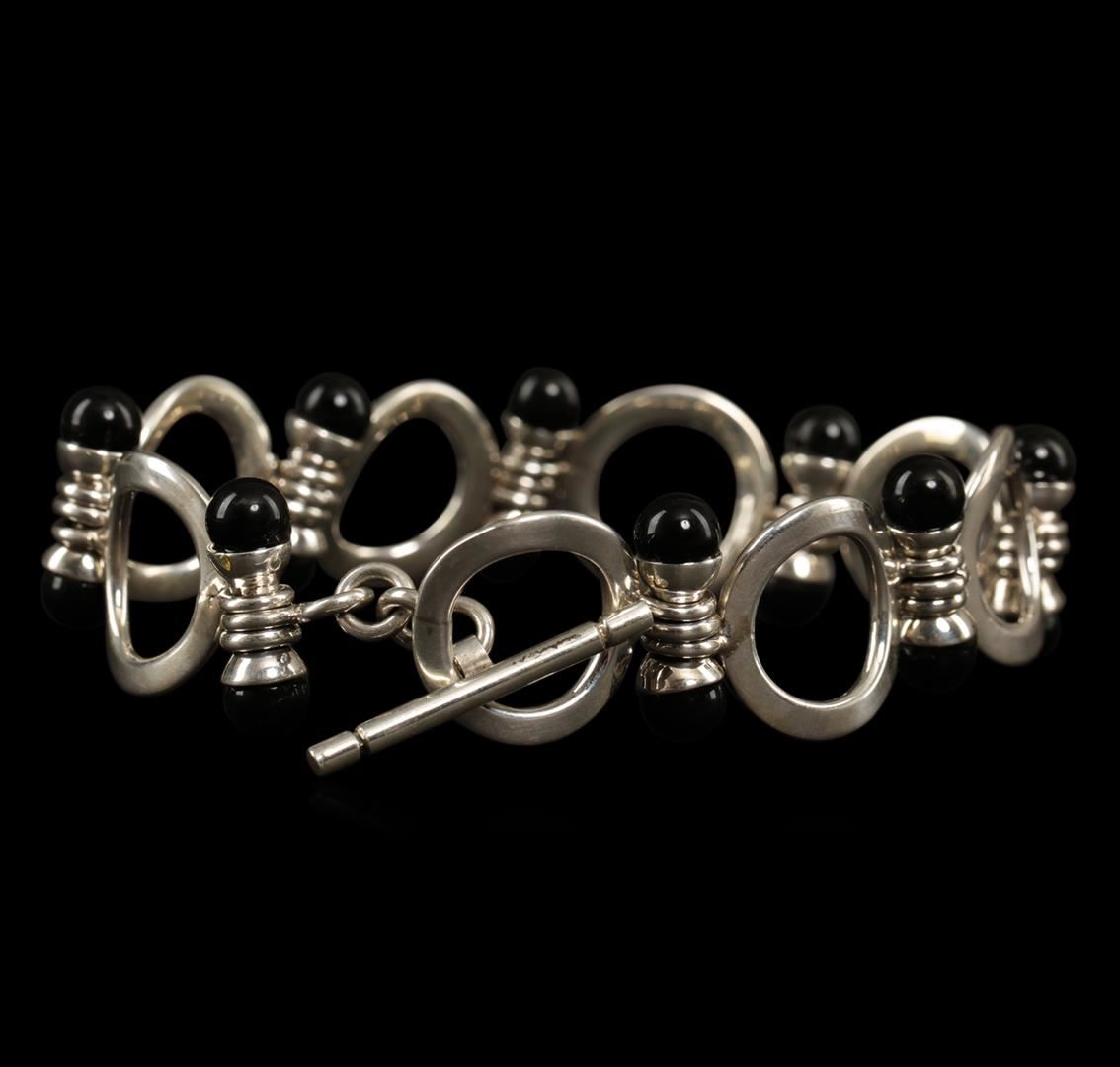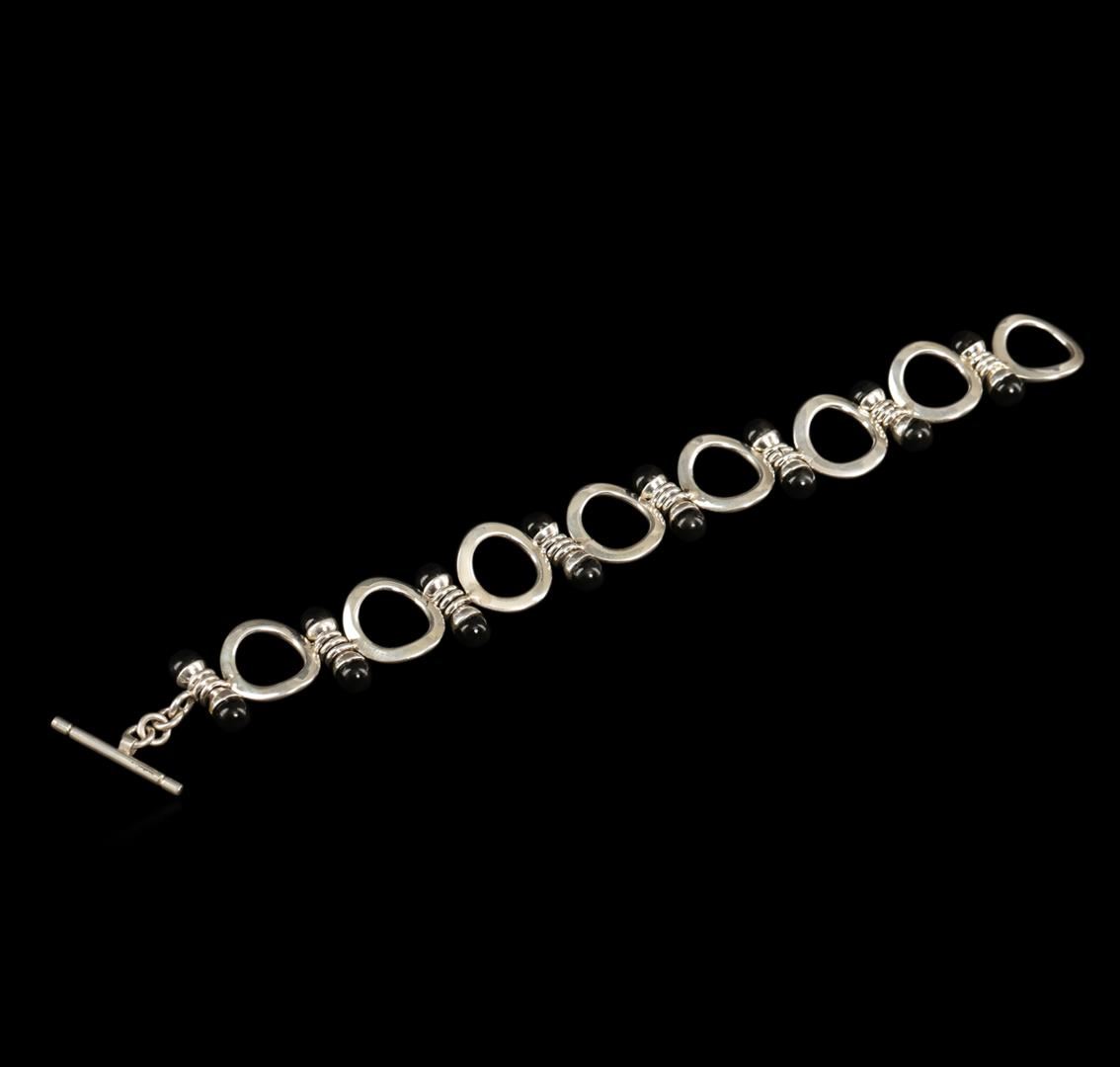 One of a kind high fashion sterling silver Bracelet weighing 33 grams. Containing: Black Resin Beads. This sterling silver promises a lasting shine.