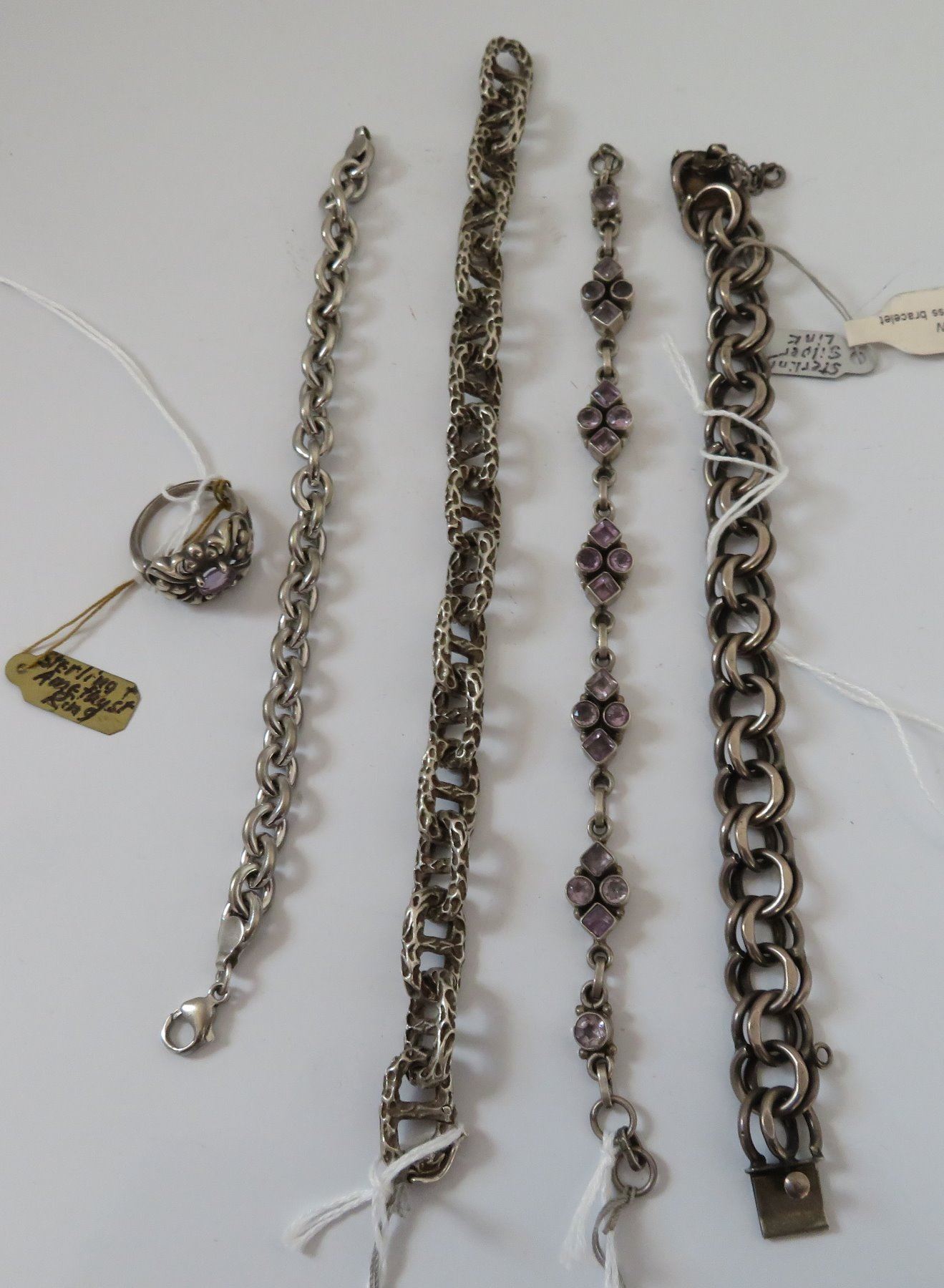 Sterling Silver Bracelets & Ring, antique items. Made of sterling silver and amethyst, the bracelets measure approx. 7"-8" long, and size 7 1/2 ring. Mexico, other regions. Condition: Good, nice patina, see images. Shipping: $20.00 w/insurance and signature.