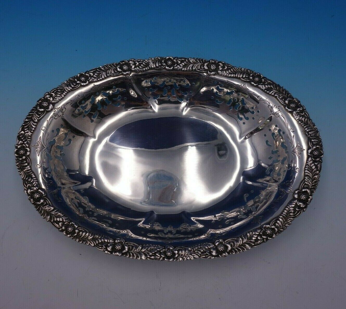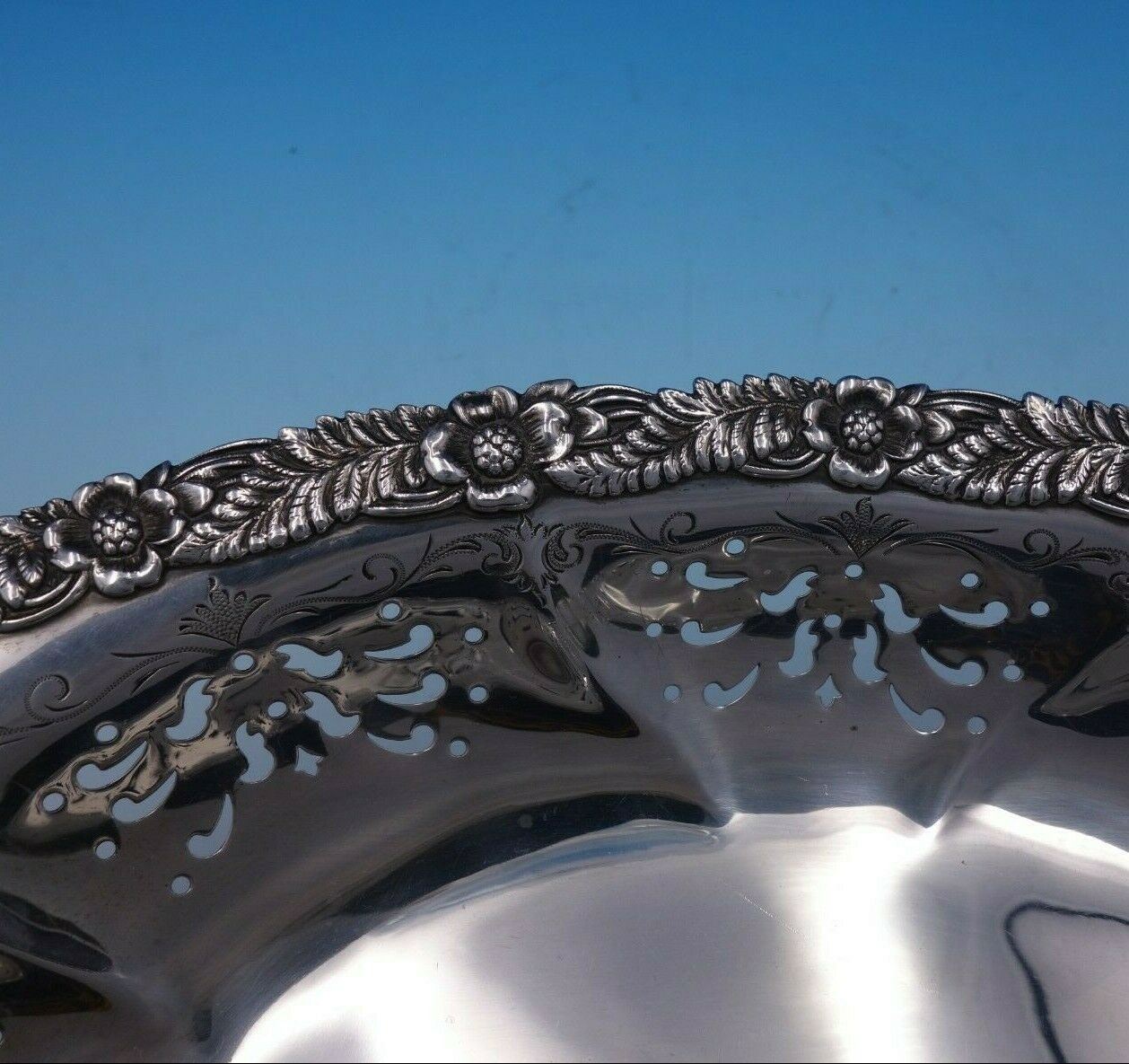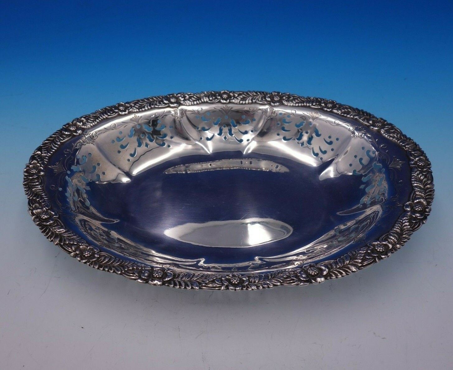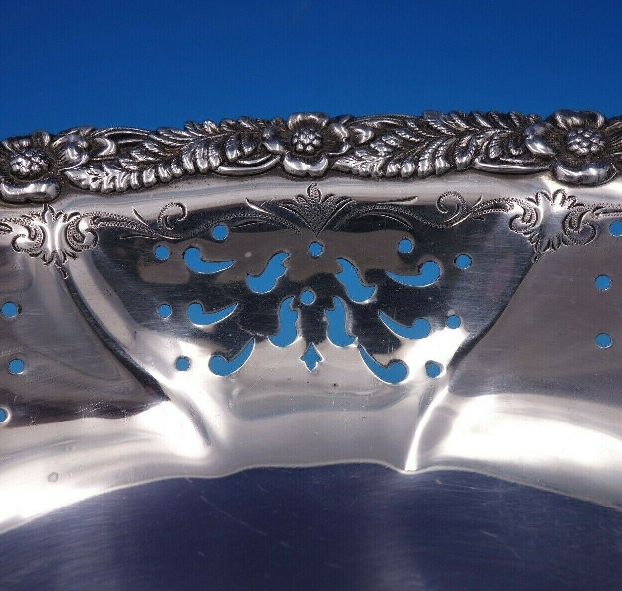 Designed by Charles Grosjean (1841-1888). Grosjean worked in his family's firm which produced high end silverware to prominent New York City retailers, including Tiffany. Upon his father's death, Grosjean left his family firm to become superintendent of Tiffany's silver factory in 1868. He had great background in silver and was an artist and was referred to as "one of the best living decorators of silver". He was a teacher in the Tiffany School and designed a few full lines of sterling patterns for Tiffany in his short time with the company before his unfortunate and sudden death. His patterns Chrysanthemum (formally Indian Chrysanthemum) and English King are some of the most famous of his designs, and of Tiffany in general. Gorgeous Chrysanthemum by Tiffany and Co sterling silver bread dish pierced and bright-cut marked #34522. This piece measures 1 1/2" (h) x 11" (l) x 7 7/8" (w), and weighs 10.9 troy ounces. It is not monogrammed and is in good vintage condition. Amazing piece!