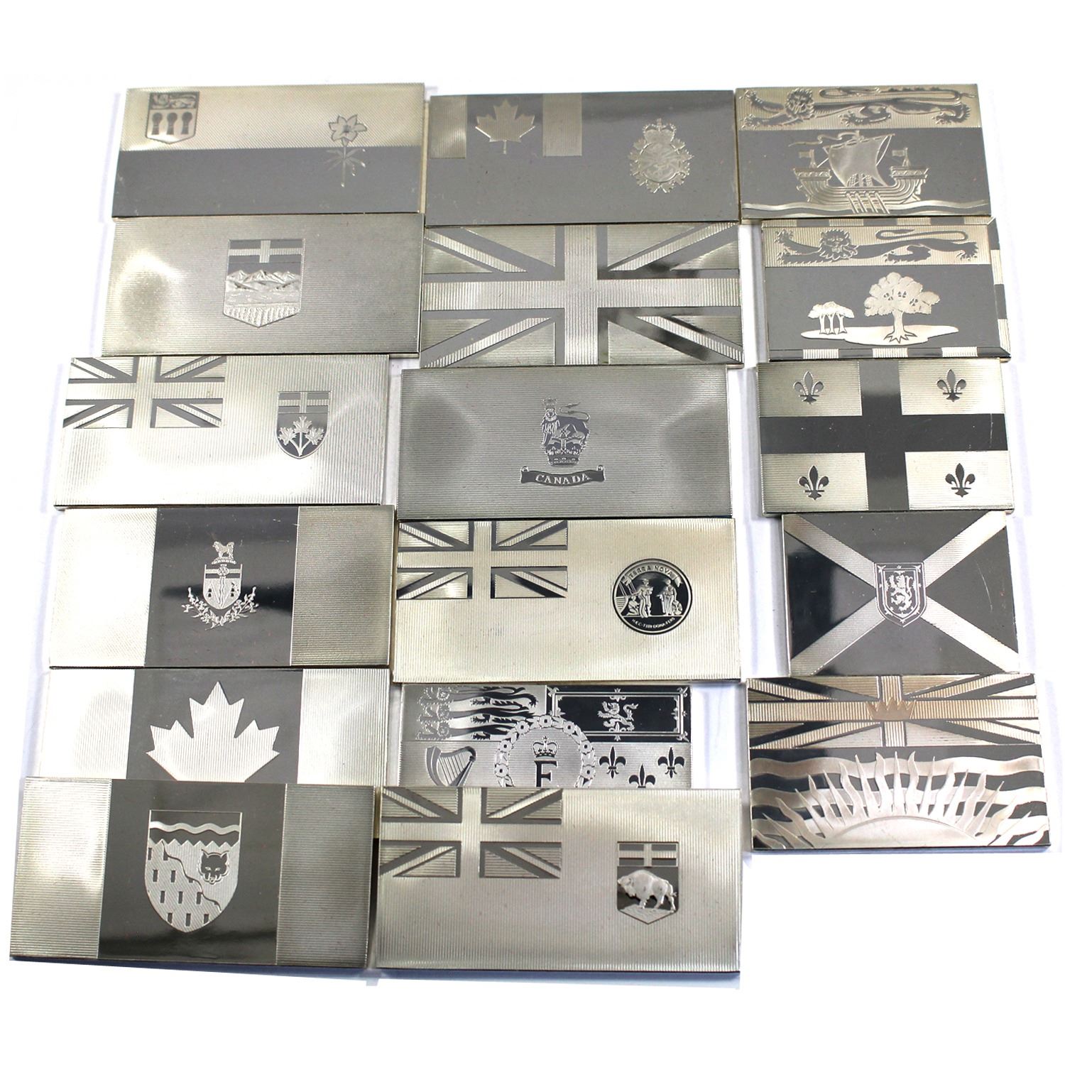 Sterling Silver Bulk Lot! 1130 grams total Weight of Sterling Silver (0.925) bars featuring the flags of Canada. (17 ingots in total!) 33.60oz fine silver content (Bars may be lightly scratched or toned).