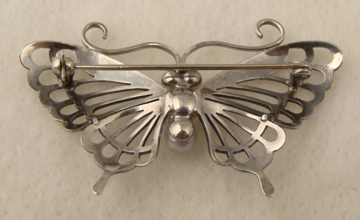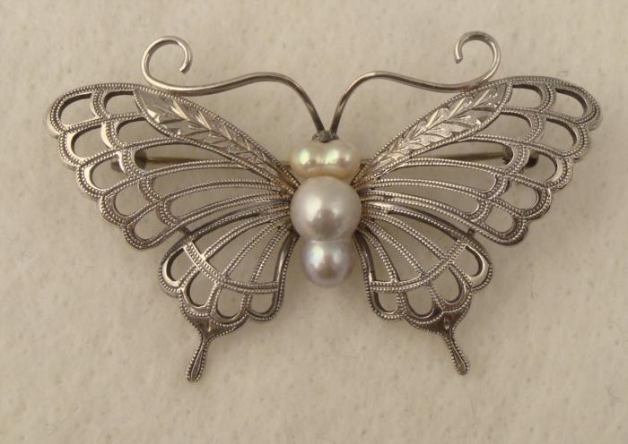 This little butterfly has elegant pierced silver wings (not marked), with a body made of Baroque pearls (fused). The size is 2 1/8" wide. It is in excellent condition.