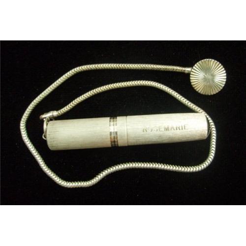 Elegant sterling silver collapsible ballpoint pen with button chain. Adorable miniature pen easily extends to a comfortable size and has a long snake chain with a small button for attaching to clothes. This pen came from Stelling & Fyldepennede in Denmark. I do not believe that the subsidiary that this pen came from is still operational. The pen has its' original small white box with a business card that states that it came from E. Hye-Knudsen in Denmark, it also has a handwritten note from the salesman on the back about refills. It has the name Rose Marie engraved on it and a small crack but isn't very noticeable. The pen does write but I don't know how much ink is left. A great unique piece for any pen collector. Closed pen almost 2 1/8" long, Open pen almost 3 5/8" long, Chain 9 1/2" long.