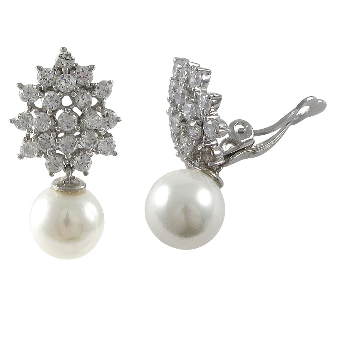 Sterling Silver CZ Cluster With Dangling 10Mm White Pearl Clip On Earrings- 1.15"